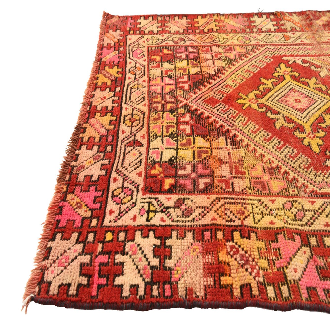 A 3x5 rectangular Anatolian rug in vibrant reds, yellows, and pinks, featuring a traditional geometric pattern.