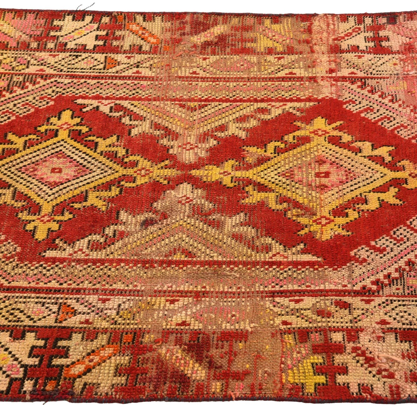 Primary color is Red. Colors in this rug include: Red, Black, Ivory, Yellow, Pink.