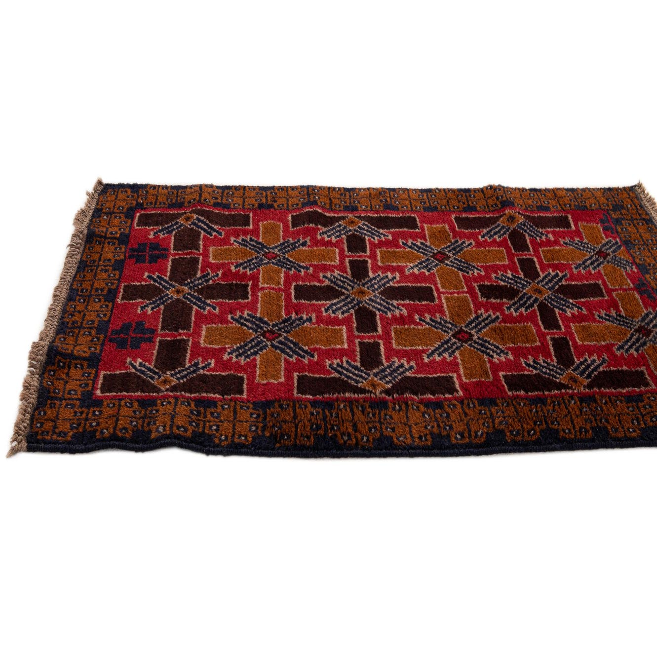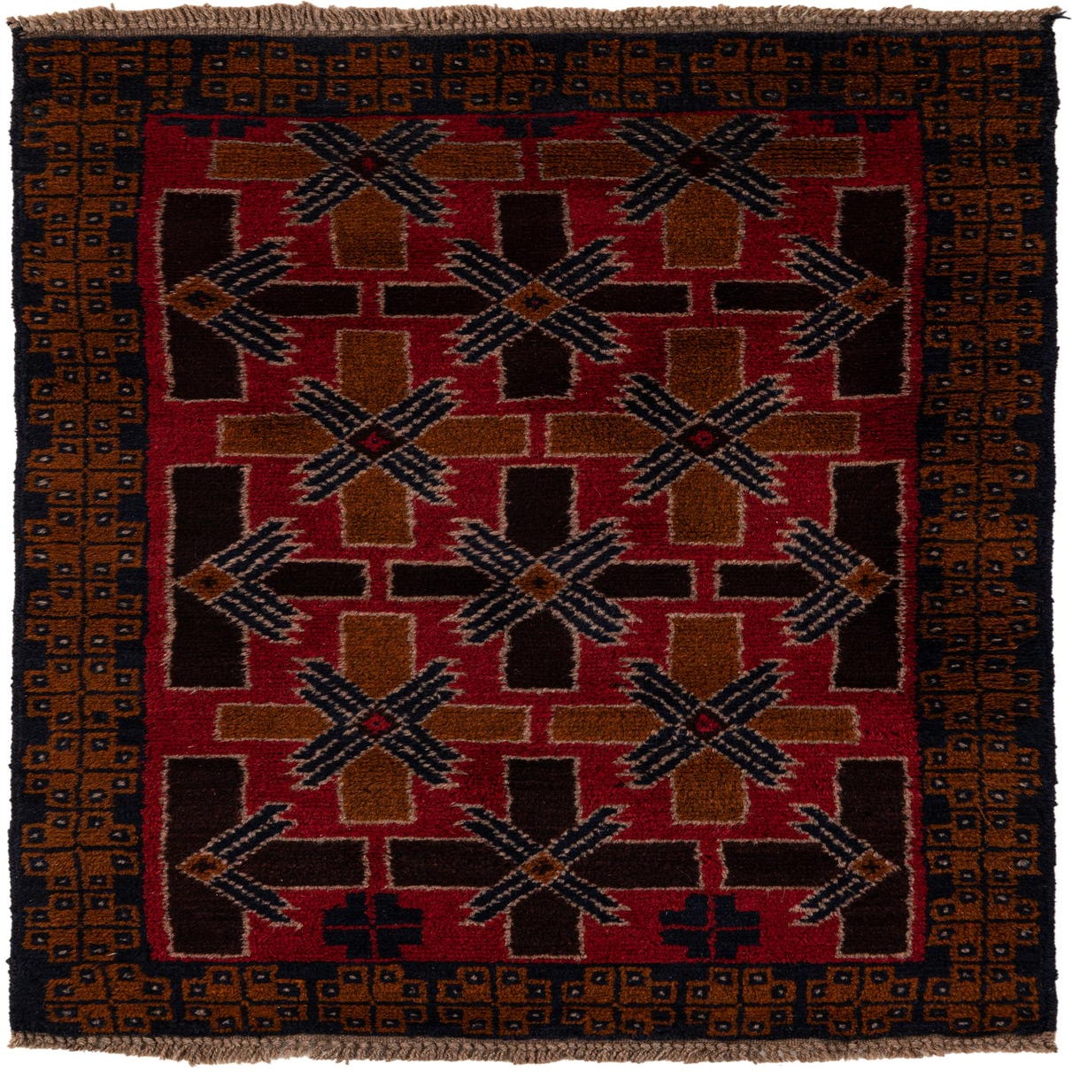 A 3x5 rectangular Balouch tribal rug in shades of red, brown, and black, featuring geometric patterns and a thin pile.