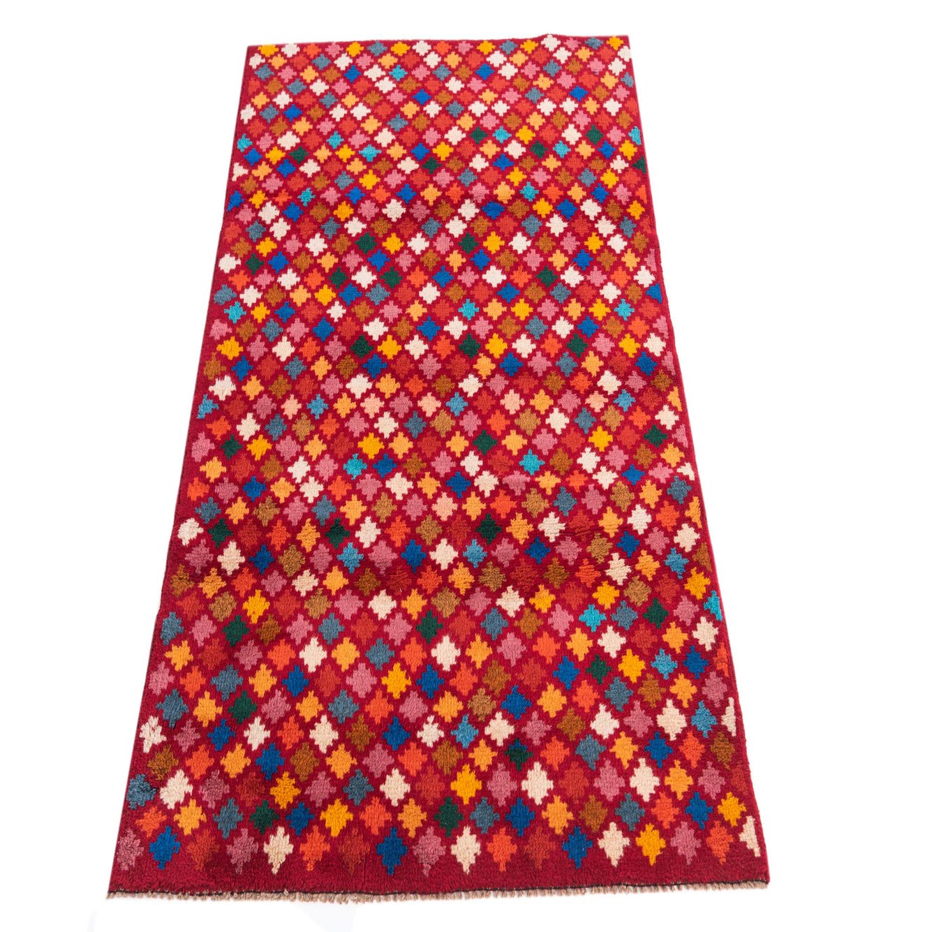 A 3x5 rectangular Balouch rug with a deep red background and a vibrant, multicolored diamond pattern, showcasing traditional tribal style.