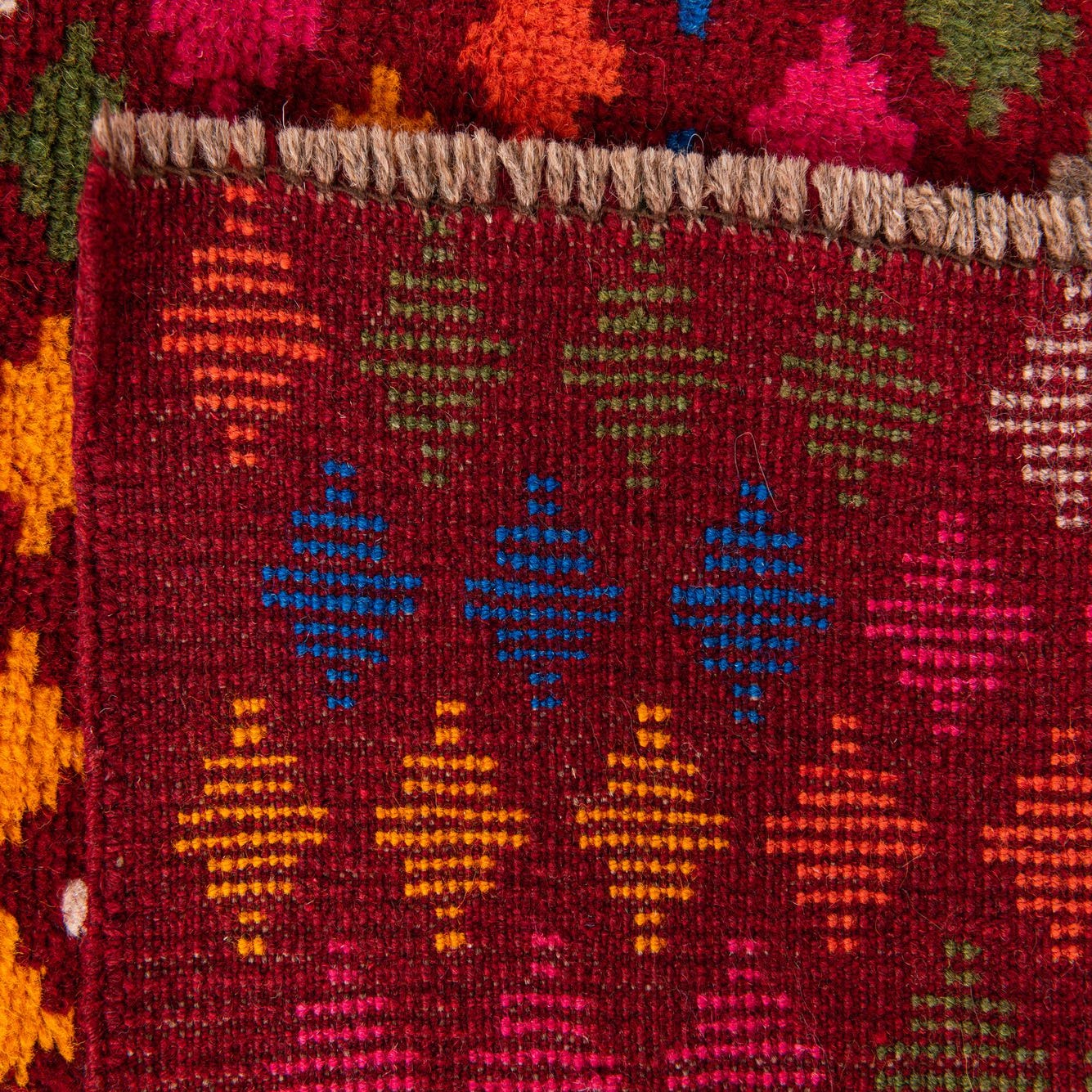 A 3x5 rectangular Balouch rug with a deep red background and a vibrant, repeating diamond pattern in various colors.