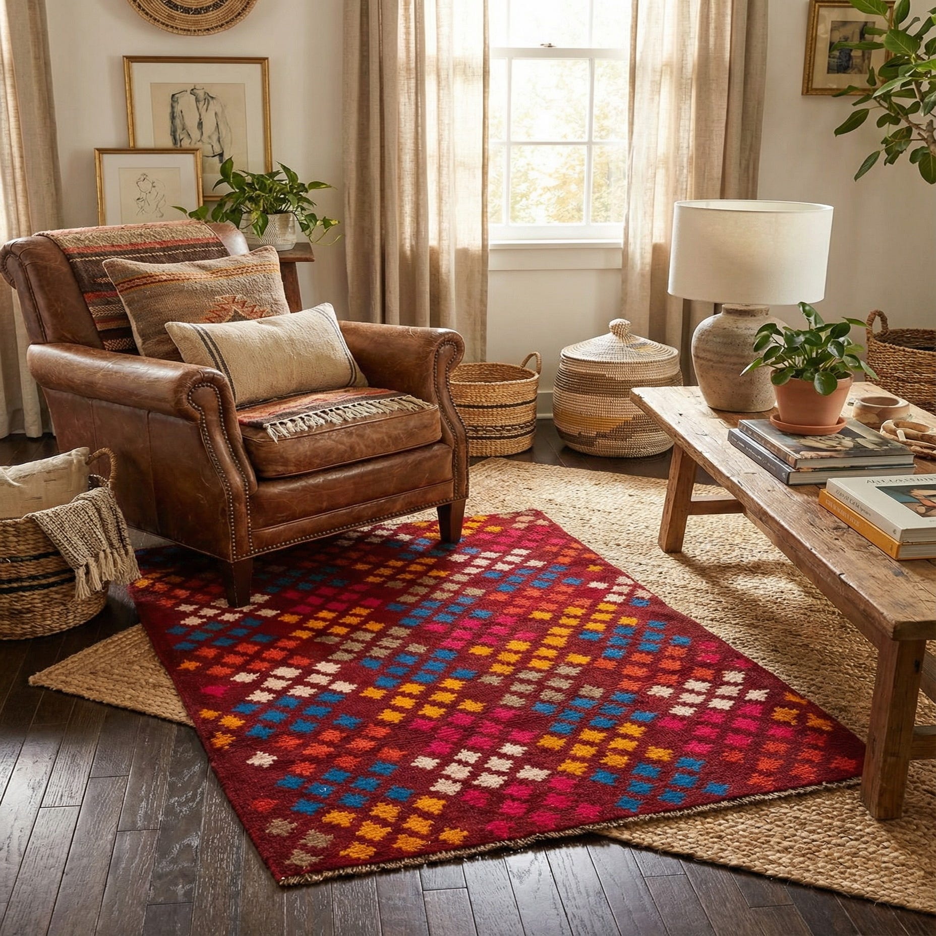 Primary color is Red. Colors in this rug include: Red, Blue, Ivory, Orange, Yellow, Pink, Beige.