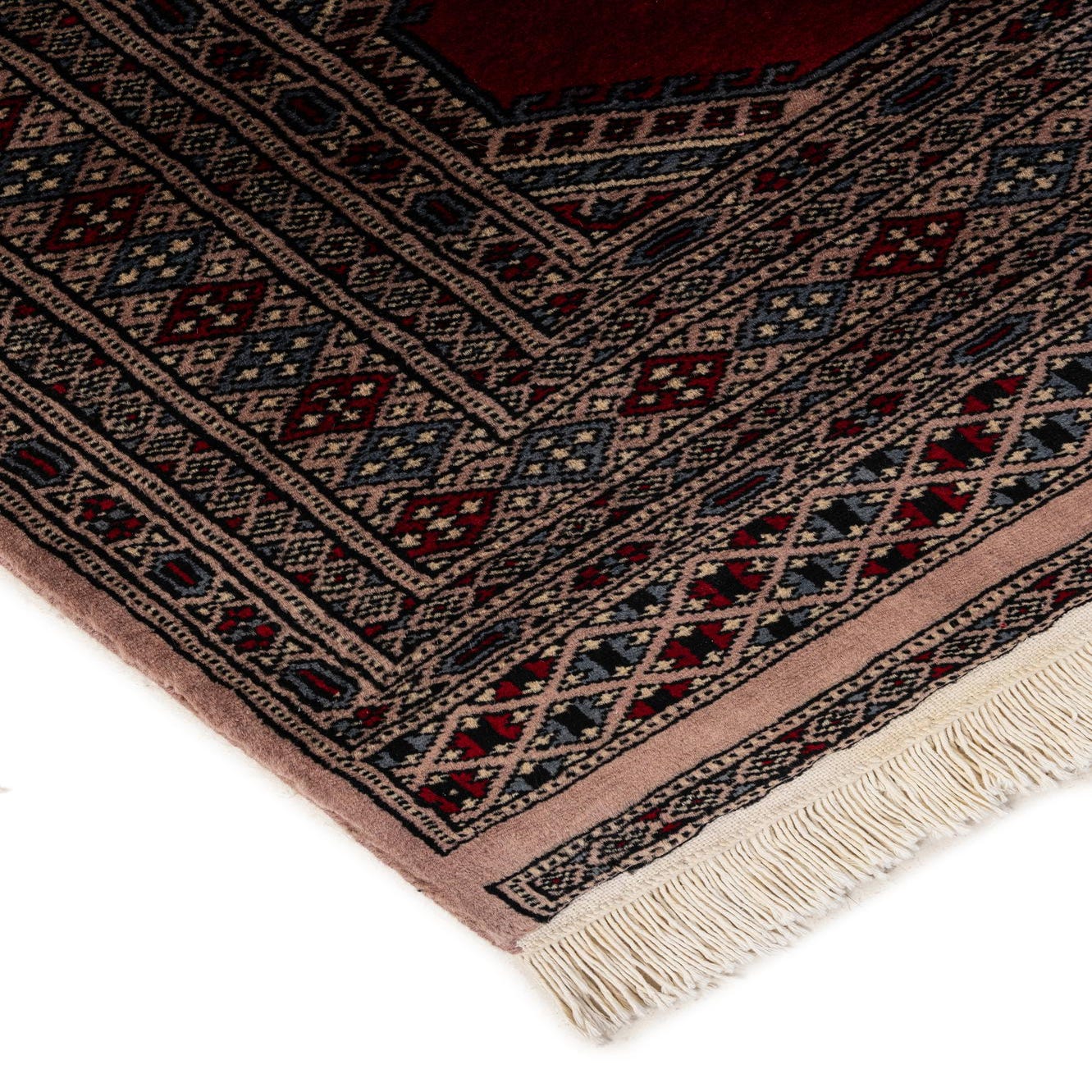 A 3x5 rectangular Bokhara rug with a deep red field, intricate tribal patterns, and ivory fringe.
