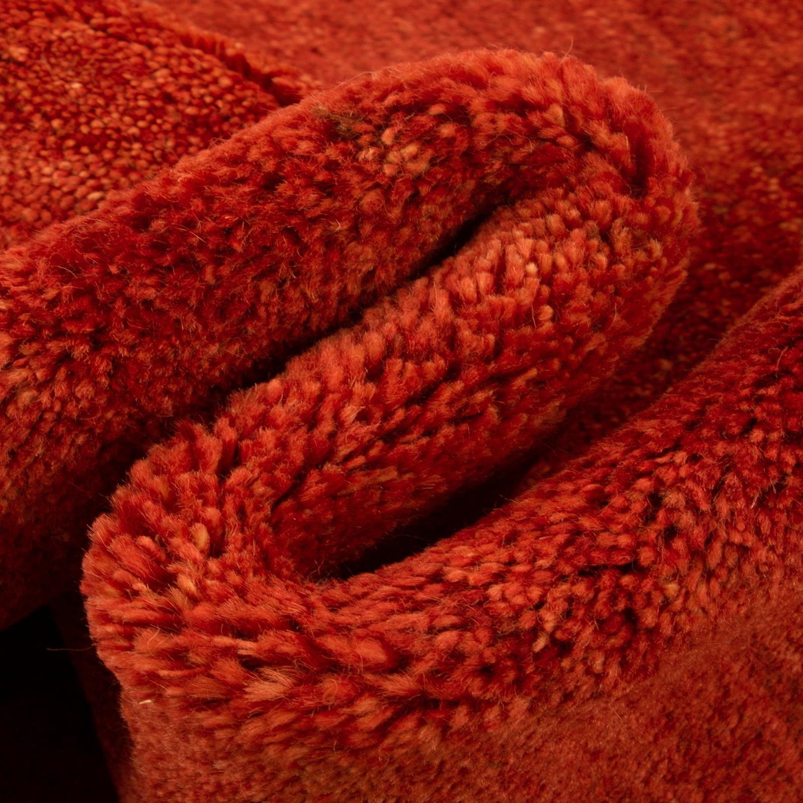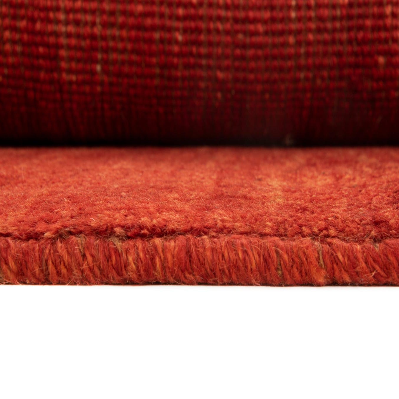 A 3x5 rectangular red Gabbeh rug with a medium pile and subtle multi-color geometric accents in the corners.