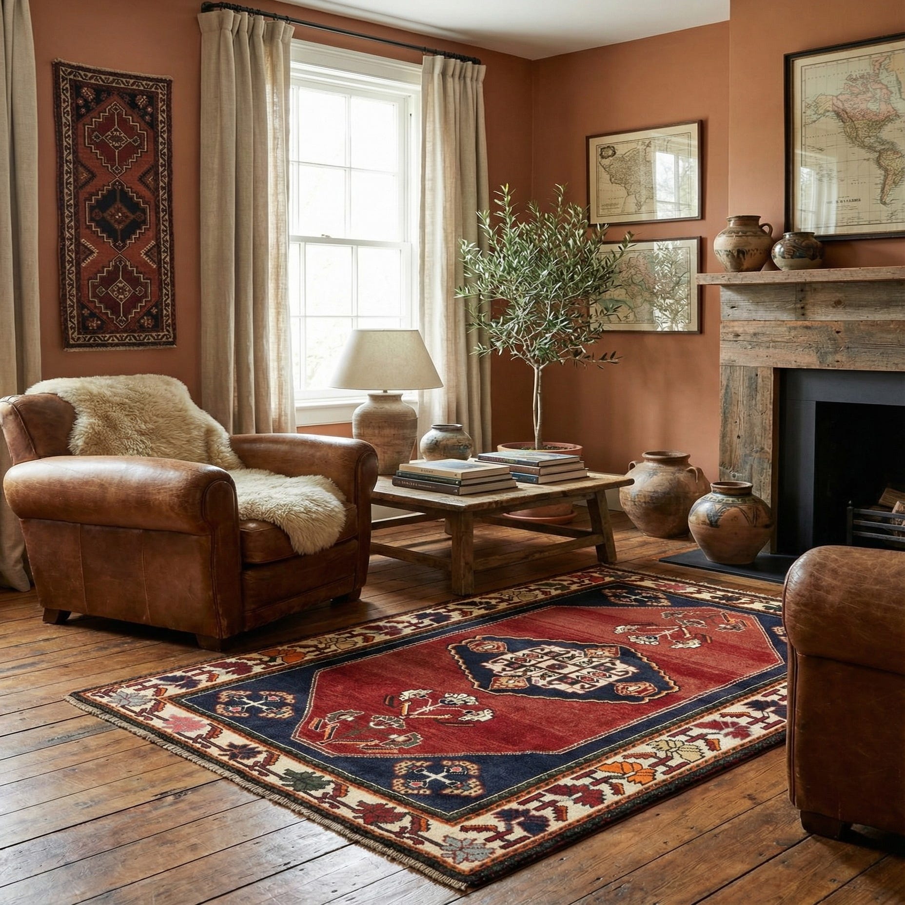 A 3x5 rectangular Ghashghai Persian wool rug with a rich red field, navy accents, and a multi-colored floral border.