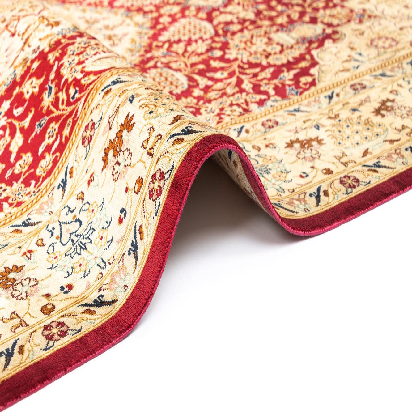 A luxurious 3x5 rectangular Persian rug with a rich red background and intricate cream, gold, and blue floral patterns, featuring a central medallion design and cream fringe.