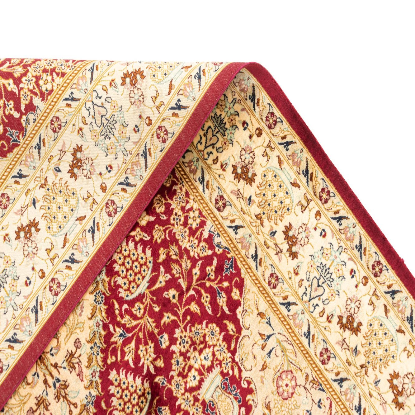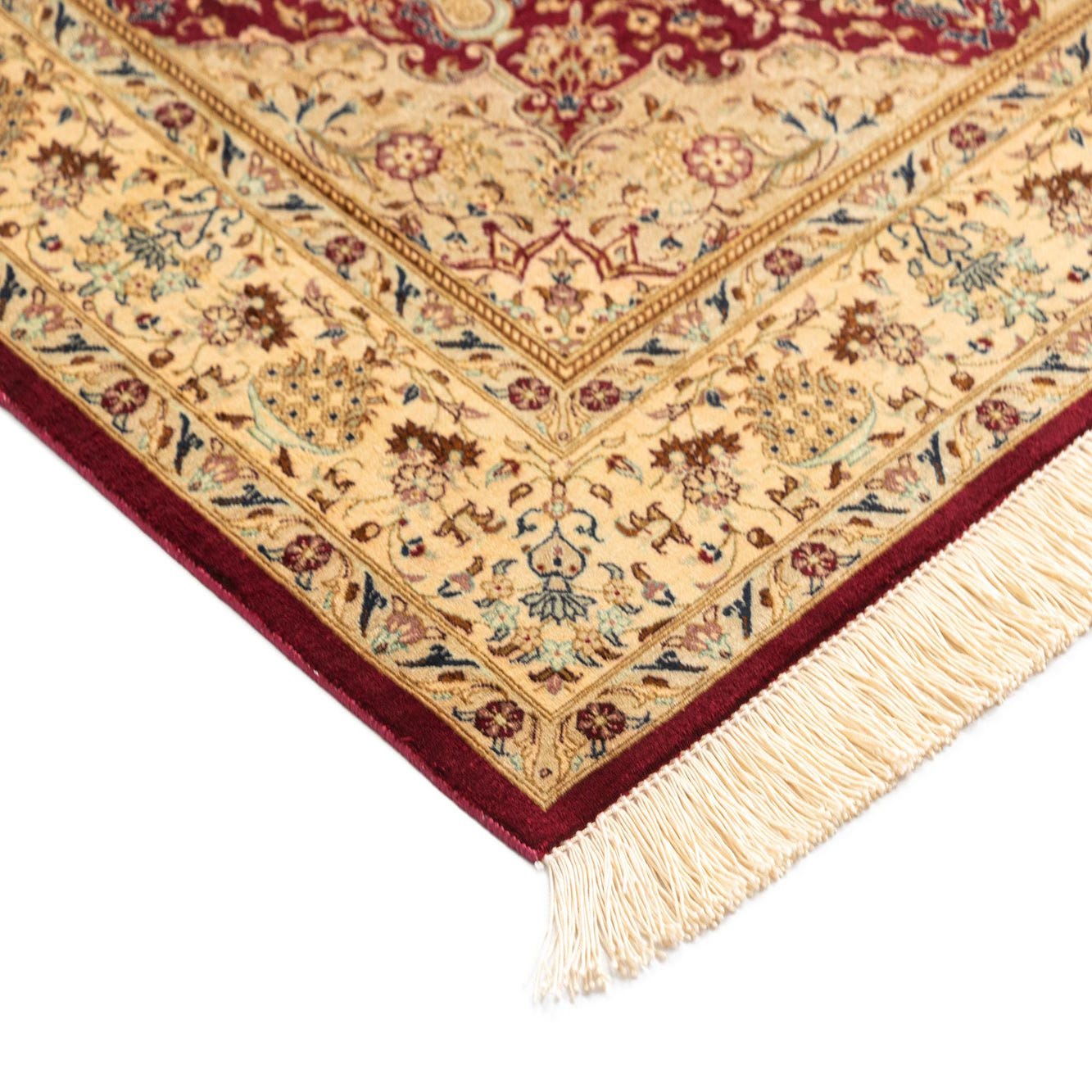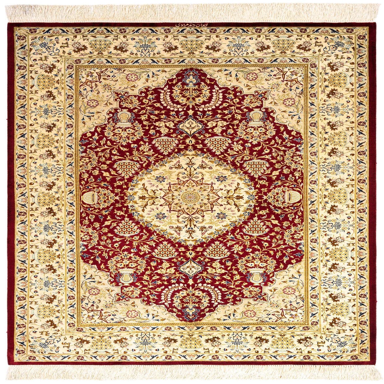 The Ghom Silk collection presents a hand-made silk rug that combines a vibrant red background with a sophisticated pattern showcasing hues of cream, beige, dark blue, and light brown. This 3x5 piece features intricately designed central medallions surrounded by floral accents and border detailing that highlight the craftsmanship of this fine silk creation. The smooth texture and sumptuous feel of the silk weave emphasize the rug’s luxurious appeal.