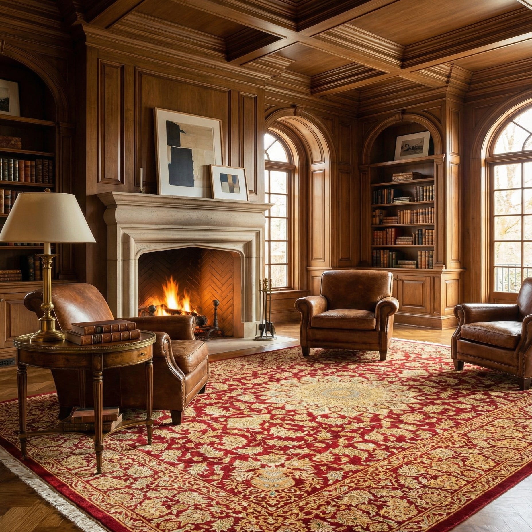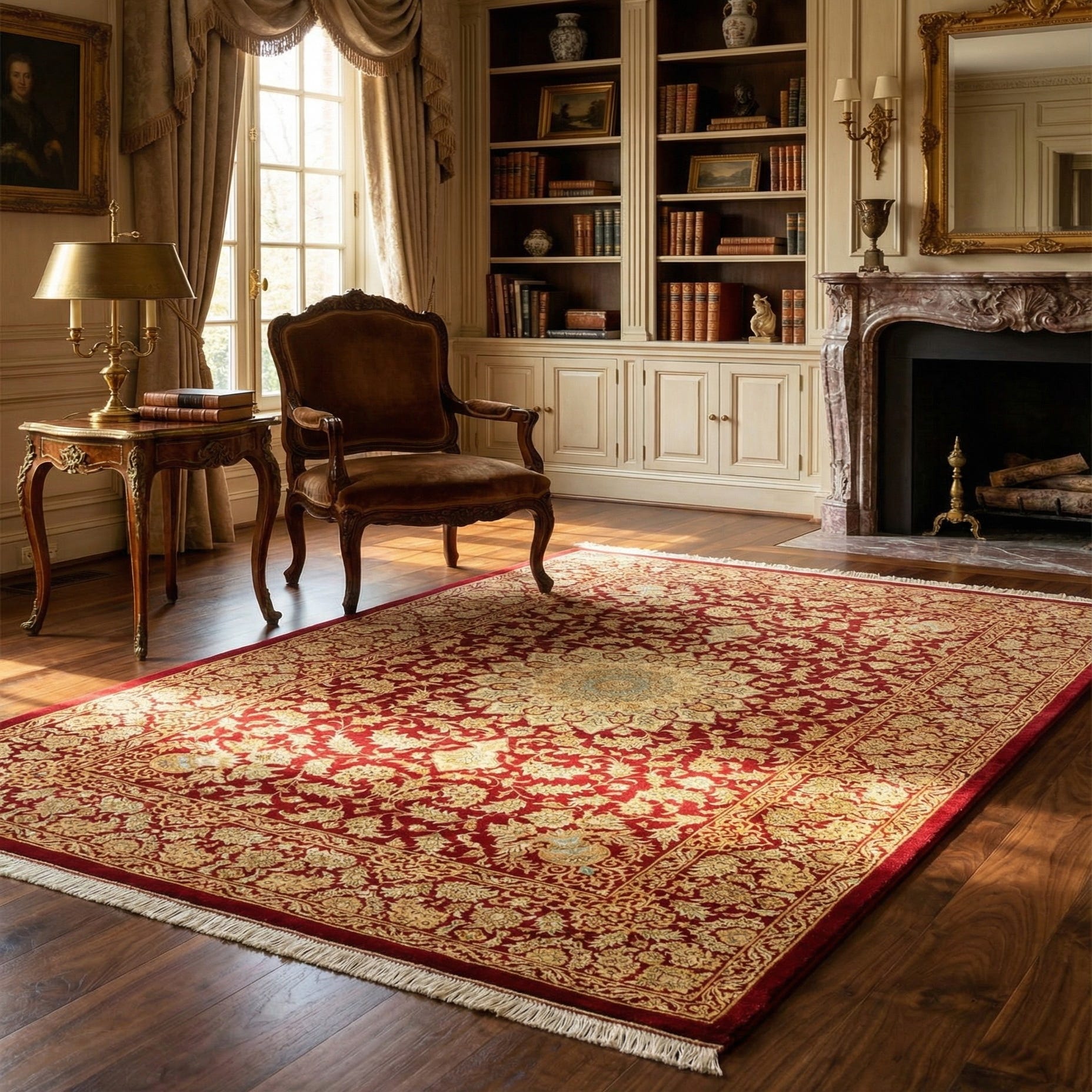 This rug would be an elegant addition to interiors with a classic or formal decor, adding a regal presence to living rooms, dining areas, or private libraries. It could serve as a focal point in a minimally decorated space or complement a room with rich wood tones and other luxe textiles. The versatile color palette allows for cohesion with a variety of interior color schemes.