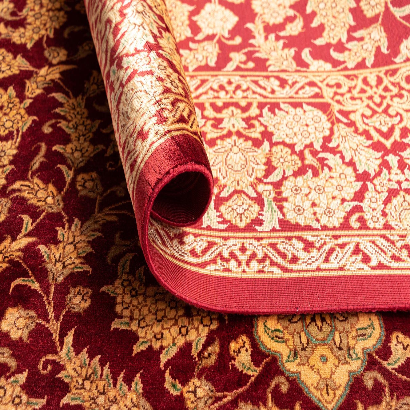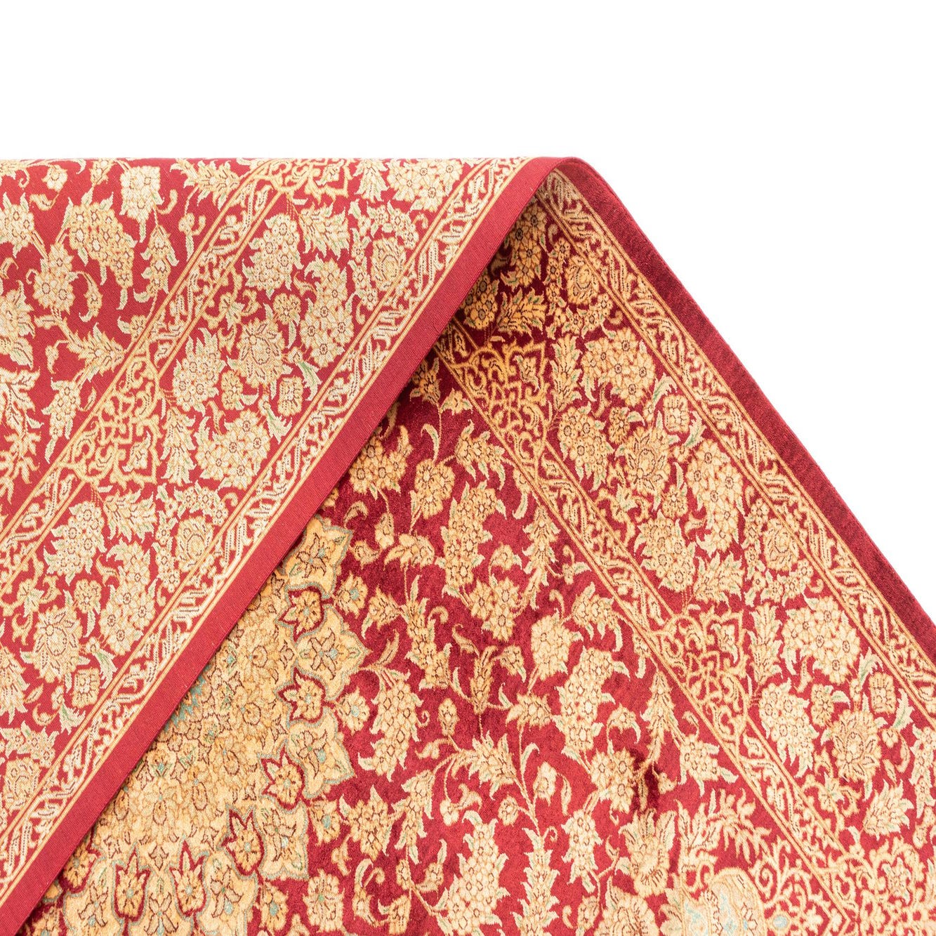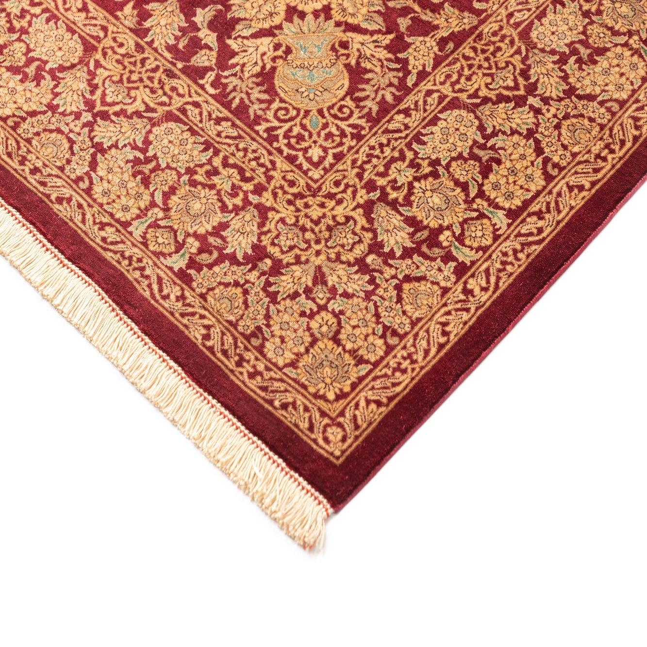 A luxurious 3x5 rectangular Ghom Silk Persian rug in deep red with intricate gold floral patterns and a central medallion, featuring white fringe.