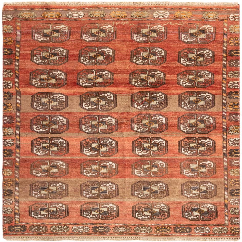 A 3x5 rectangular Hamedan wool rug featuring a traditional tribal pattern in various shades of red and brown.