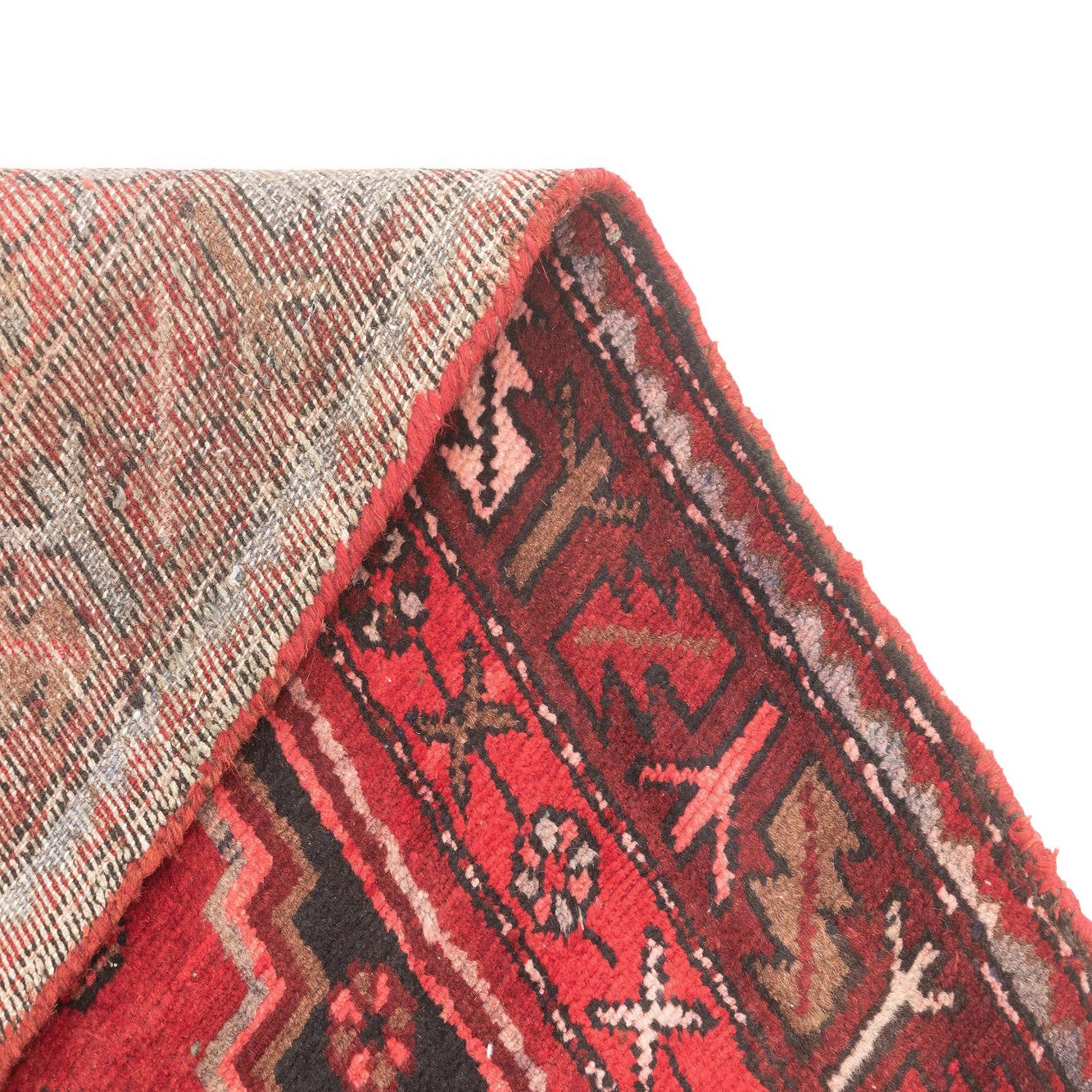A traditional Persian-inspired runner with a stepped central medallion and layered guard borders, this piece is built around a rich red ground. The design balances geometric medallion forms and small circular motifs set against a dark brown field, while accents of pink and cream pick out the floral rosettes and angular border elements. Hand made of wool, the weave produces a compact, slightly springy pile with a natural woolen luster and gentle tonal variation where the dyes sit into the fibers.