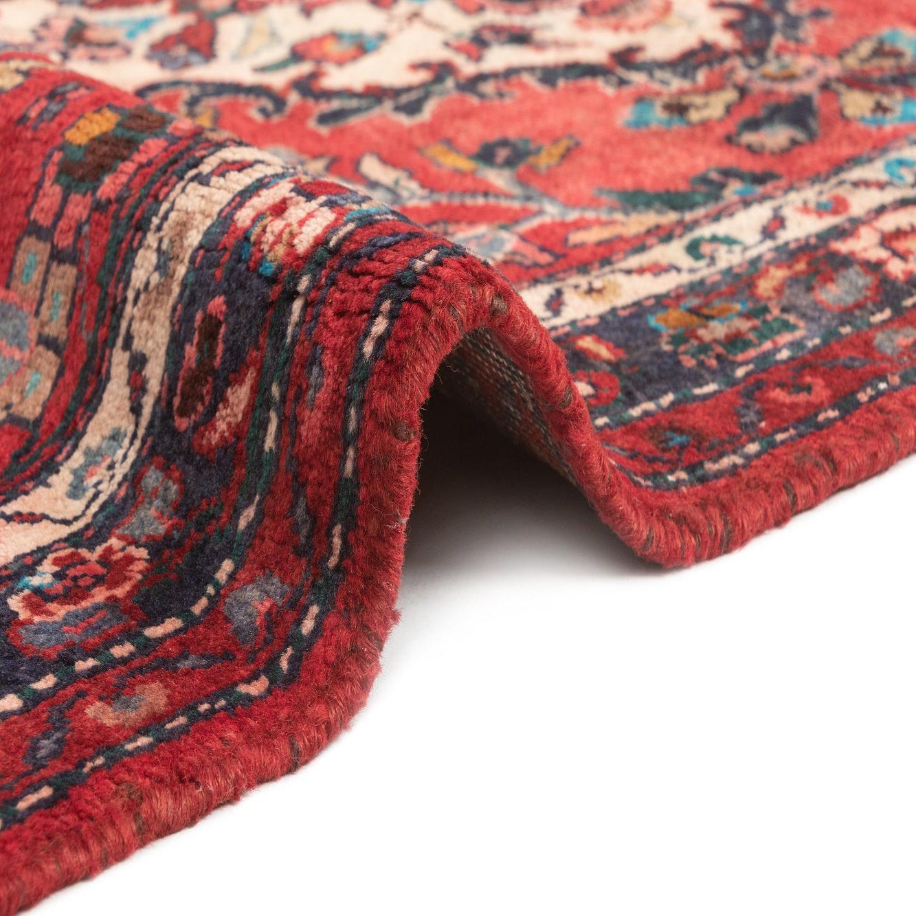 A 3x5 rectangular Hamedan wool rug in vibrant red with a traditional tribal pattern and a central medallion.
