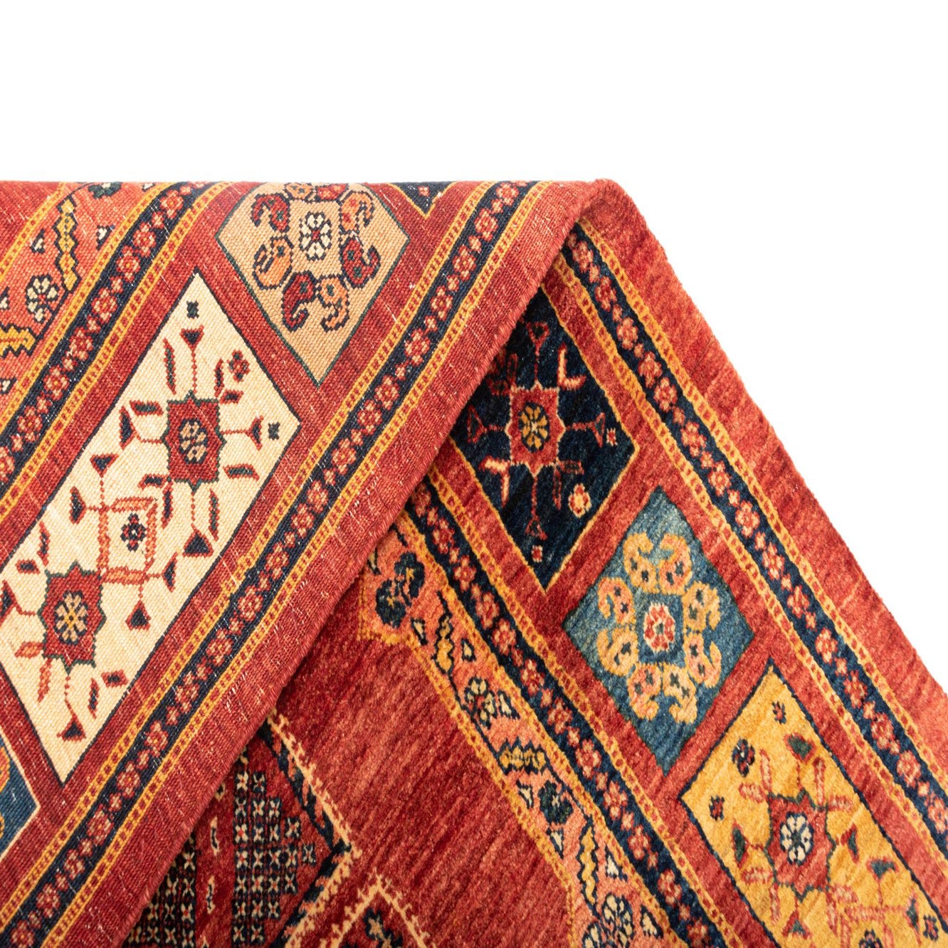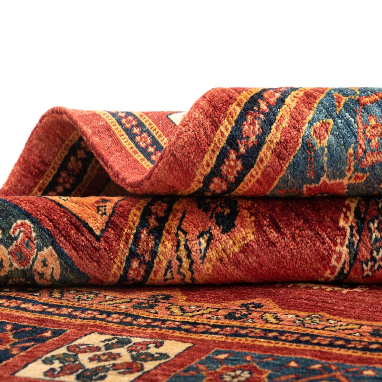 The Kashkuli collection presents a 3x5 hand-made rug, crafted meticulously from 100% wool. This rug features a dominant red background, imbued with a blend of vibrant colors including dark blue, orange, yellow, green, blue, and beige which come together to create a compelling visual tapestry. The pattern of the rug is an amalgamation of traditional motifs, including geometric shapes and detailed borders that exhibit cultural heritage and artisanal craftsmanship.