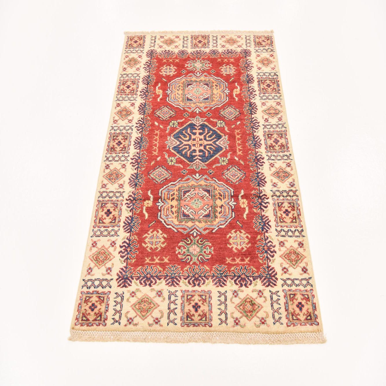 A 3x5 rectangular Kazak rug with a dominant red field and a cream border, featuring traditional Southwestern and tribal medallion patterns.
