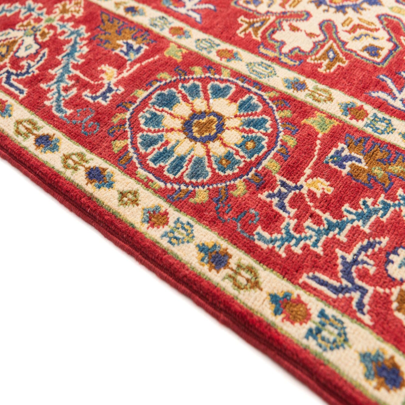 The Kazak collection presents a hand-knotted rug crafted from 100% hand-spun wool, showcasing a rich red background that anchors the piece with warmth and depth. Embracing a timeless allure, the rug features a symphony of colors, including blue, brown, cream, gold, and green, which are harmoniously integrated into the traditional patterns. The central medallion, bordered by intricate geometric motifs and stylized floral elements, lends a classic and sophisticated touch to the composition.