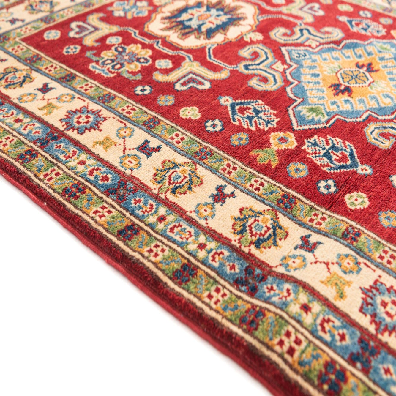 A 3x5 rectangular red traditional Kazak rug with an intricate medallion pattern and cream, blue, and gold accents.