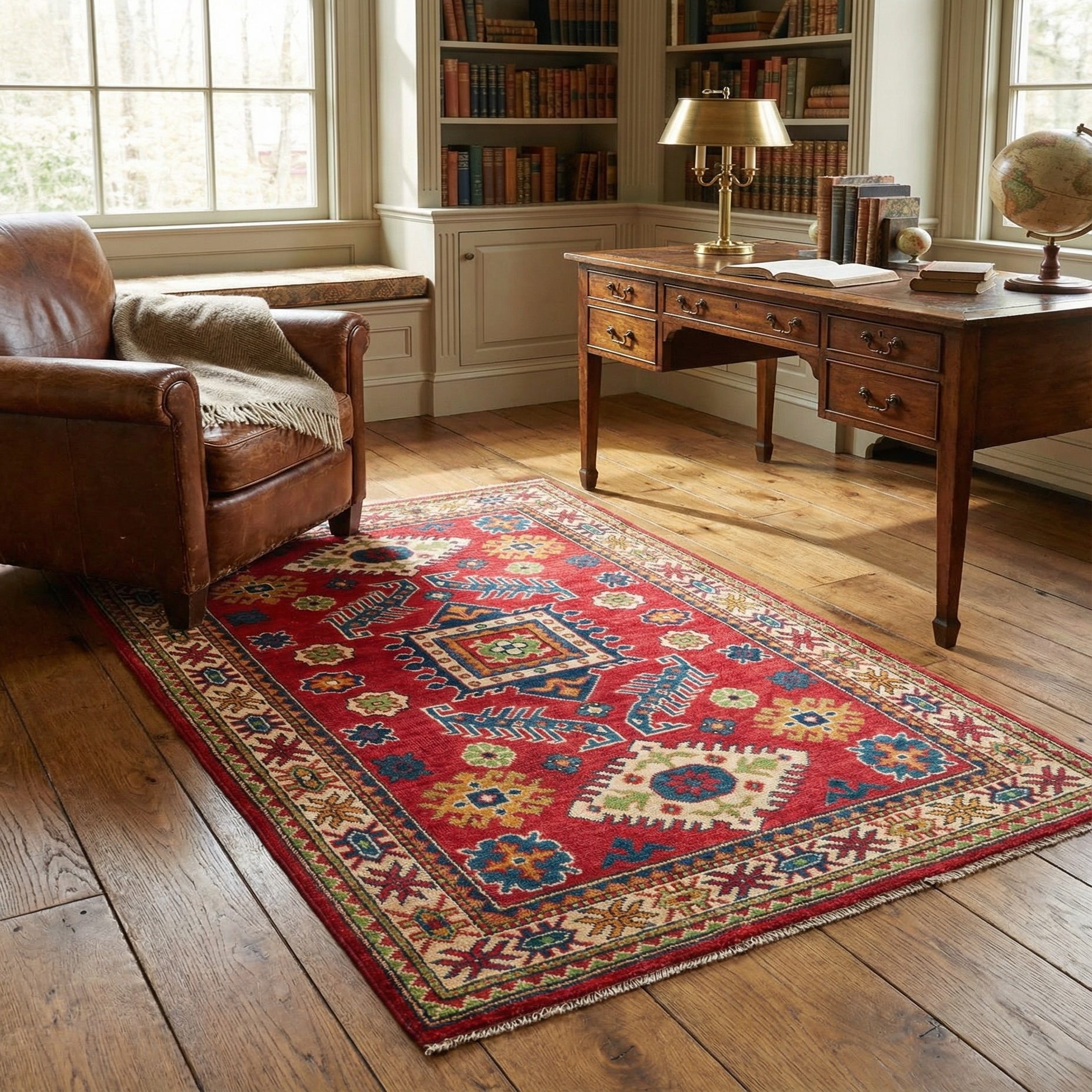 Hand-knotted from 100% hand-spun wool, the surface has a tactile, slightly varied texture from the hand-spun yarn that gives the pile depth and character. The knotting produces a dense, resilient feel underfoot and the colors hold a lively, handcrafted quality. Place this rug in an entryway or by a seating group to introduce warmth and pattern, layer it over a larger neutral rug for visual interest, or use it beside a bed or under a small dining table. It complements warm wood tones, leather and mid-century or eclectic furnishings, and works equally well in both casual and more composed interiors.