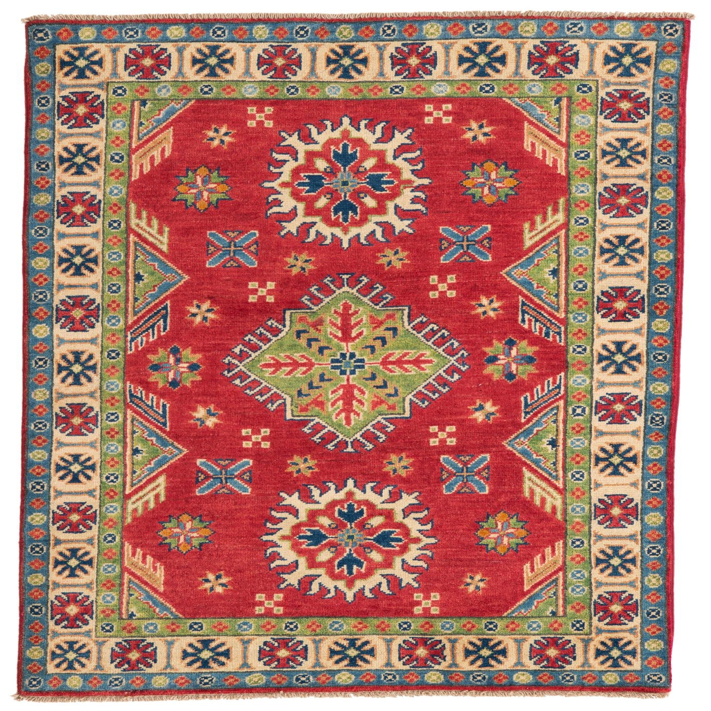 A 3x5 rectangular Rugs.com Kazak rug in rich red with traditional Southwestern and Oriental patterns in blue, green, and cream.