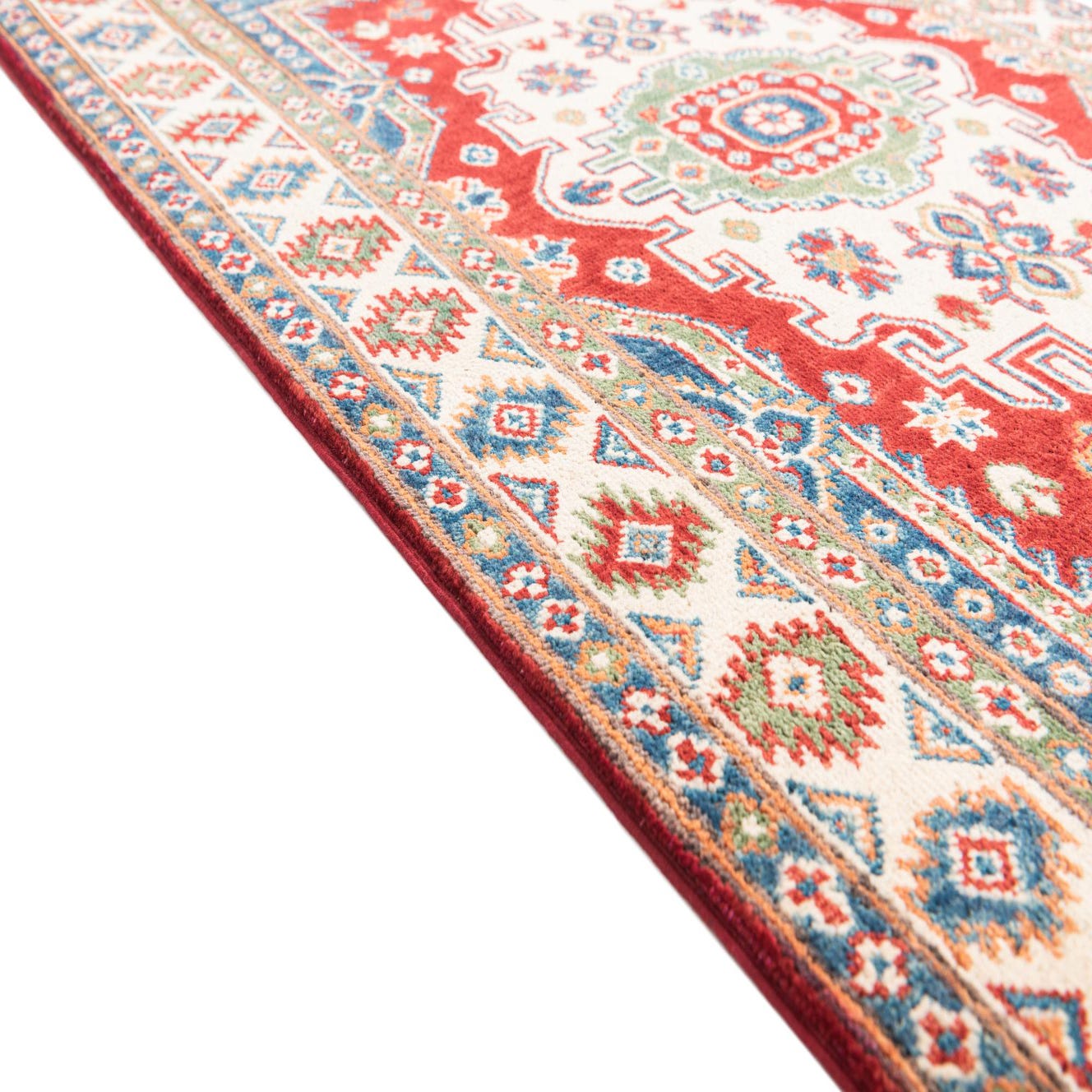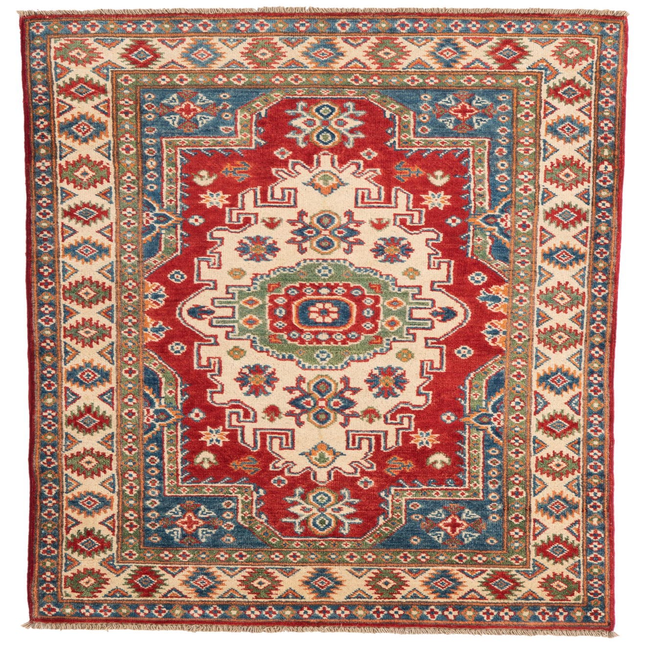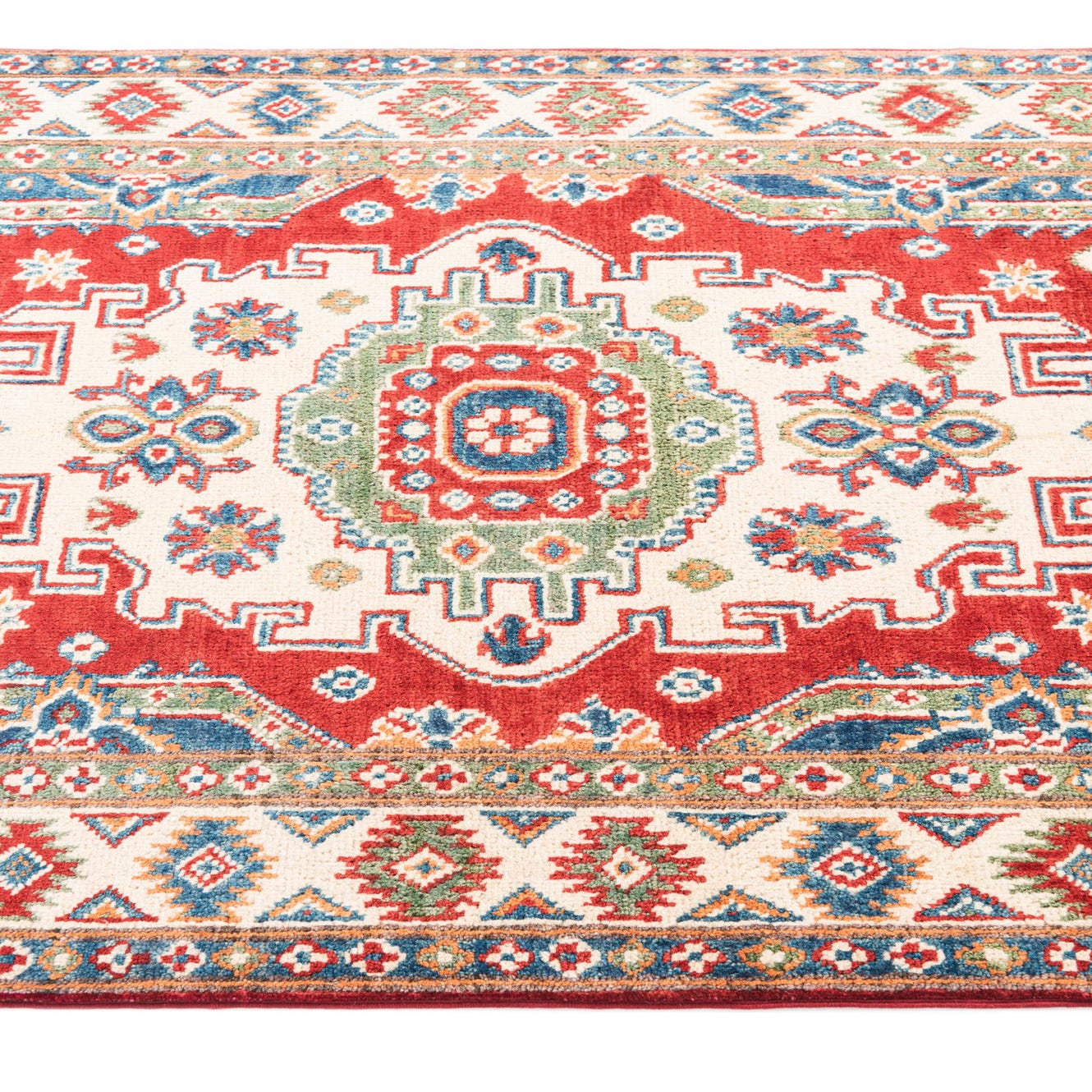 The Kazak collection showcases a 3x5 hand-knotted rug, crafted with exceptional skill from 100% hand-spun wool. This piece features a bold and vibrant palette, including red, blue, brown, cream, green, navy blue, and yellow. The red background anchors the overall design, providing a warm base for the intricate pattern work. Traditional motifs adorn the surface, arranging themselves in an ornamental lattice-like structure with notable geometric symmetry. The central medallion, surrounded by floral elements and border detailing, draws the eye and serves as a focal point. Texturally, the hand-spun wool offers a substantial and authentic feel, echoing the quality of craftsmanship.