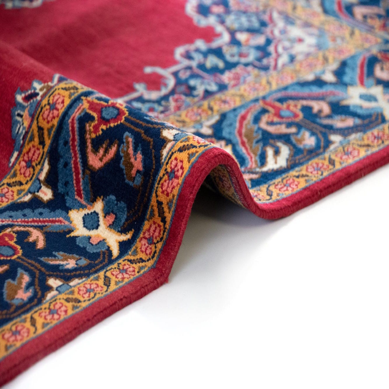 A 3x5 rectangular Kerman Persian rug with a deep red field and intricate navy, gold, and blue floral borders.