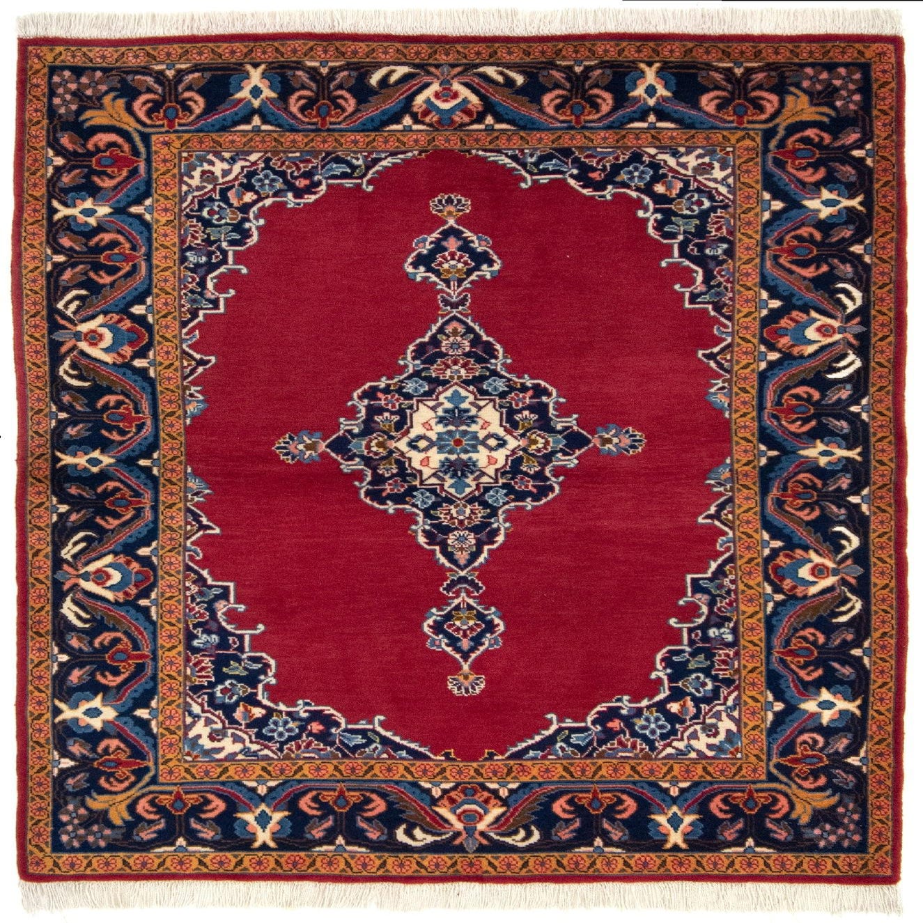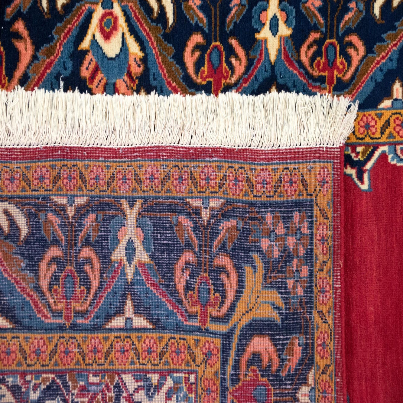 A rich red field is centered by a finely detailed medallion and framed with a deep navy border of scrolling vines and floral motifs. Blue, orange, cream and pink accents trace the medallion and border, creating clear contrasts and layered color depth across the design. The overall pattern reflects classic Persian medallion styling with balanced ornamentation and a strong central focus.