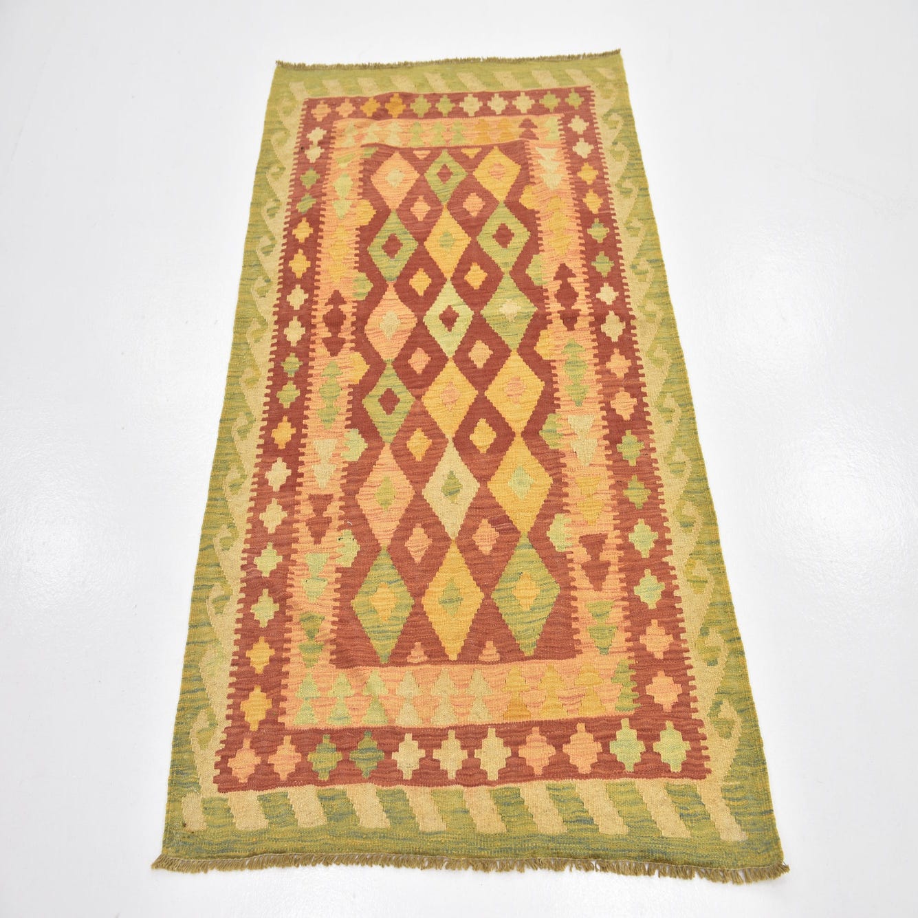 A 3x5 rectangular Kilim Waziri wool rug featuring a traditional tribal pattern in various shades of red, orange, yellow, and light green, with a diamond motif at its center.