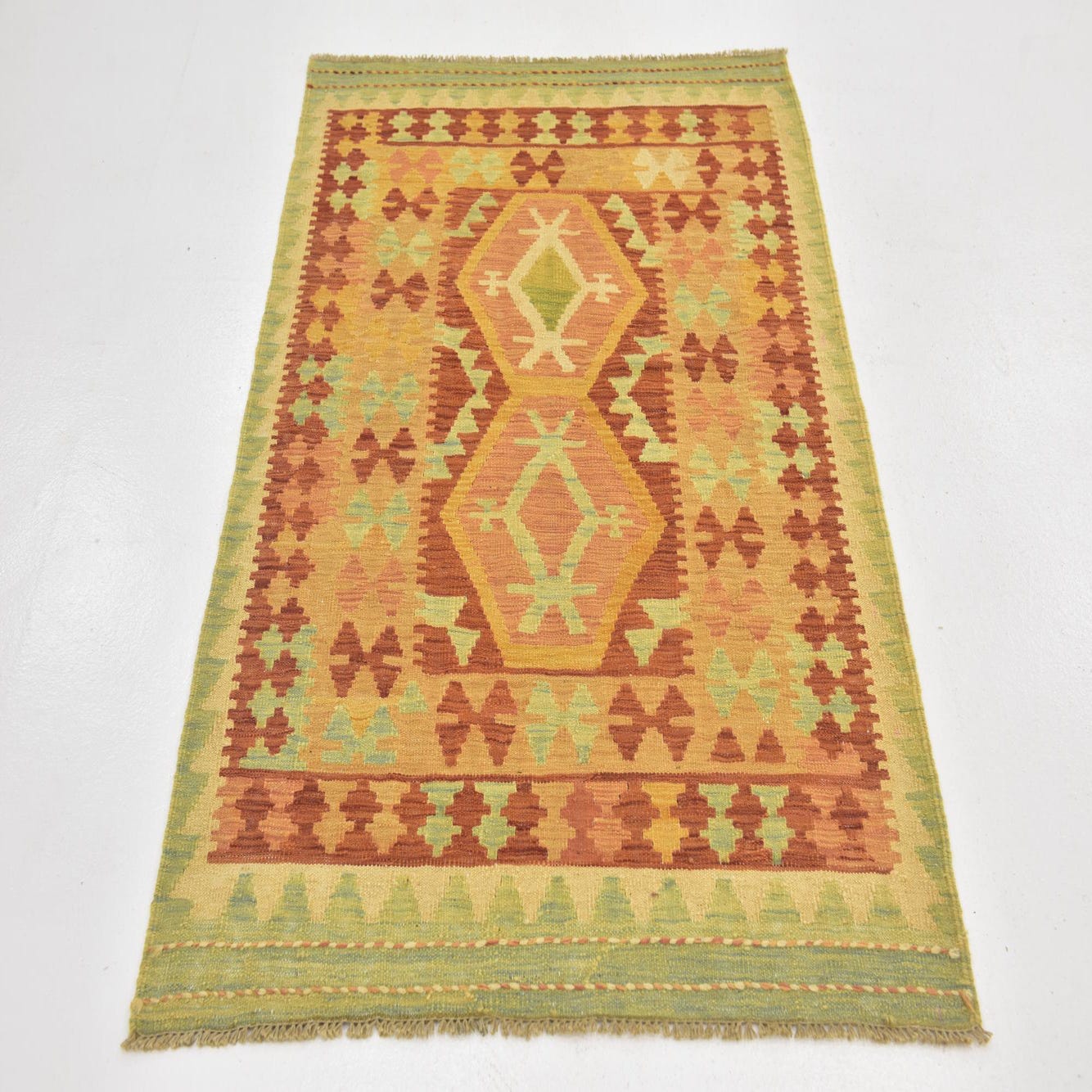 A 3x5 rectangular Kilim Waziri rug featuring a tribal medallion pattern in shades of red, orange, and light green.