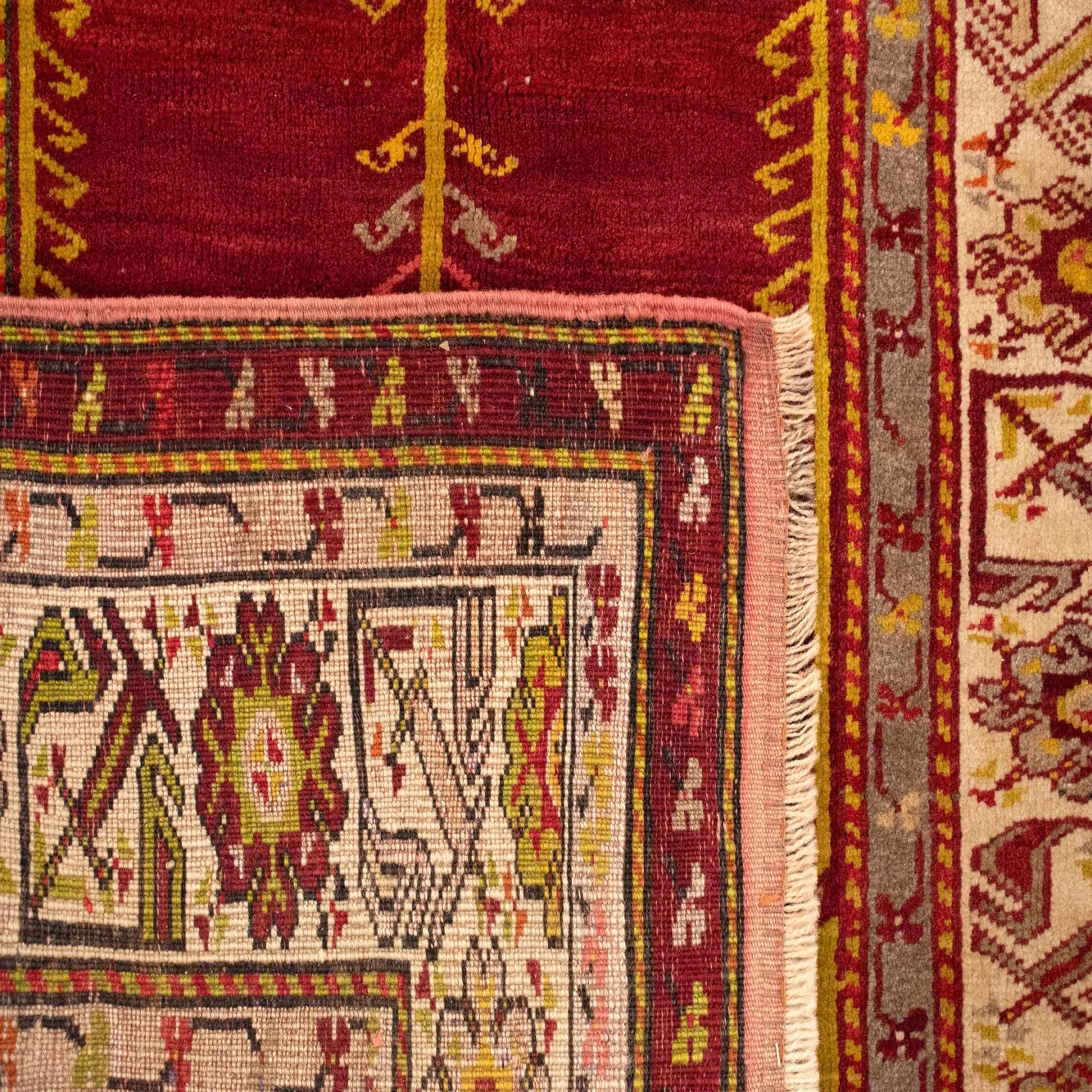 The Ladik collection offers a 3x5 hand-knotted wool rug that confidently asserts itself with a bold red background. This vibrant hue is tastefully balanced with intricate patterns in shades of beige and grey, creating a timeless aesthetic. The traditional motifs, including geometric accents and botanical elements, are meticulously woven, showcasing the craftsmanship intrinsic to this piece. The texture of the wool provides a tactile, inviting surface that complements the visual depth of the design.