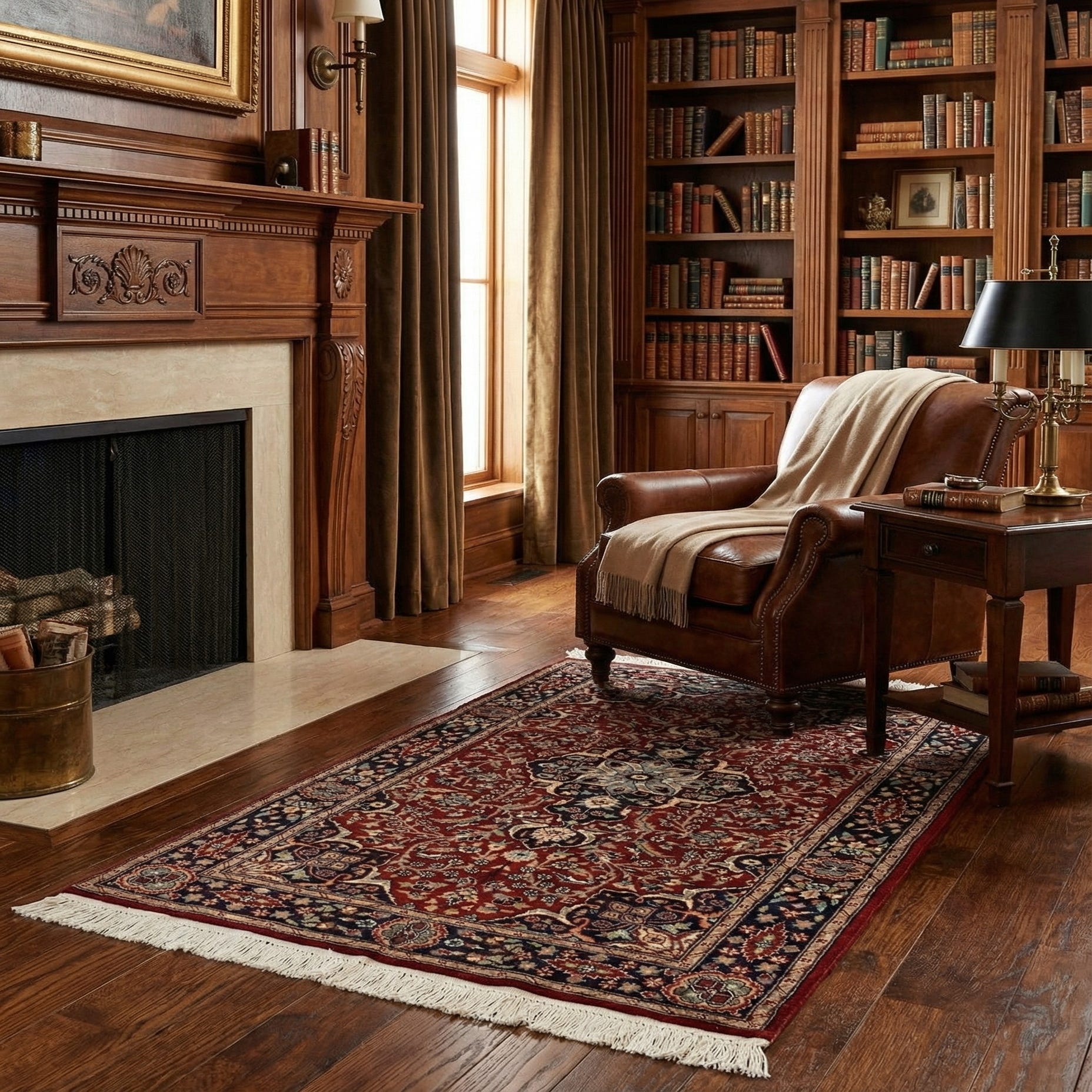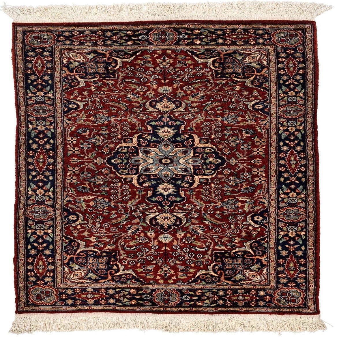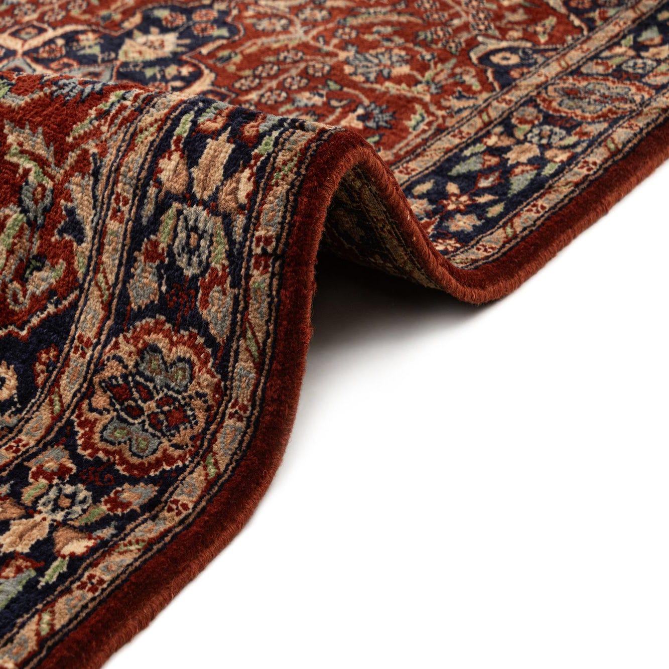 A 3x5 rectangular Lahour rug in traditional red with intricate floral patterns and a dark blue border, featuring white fringe.