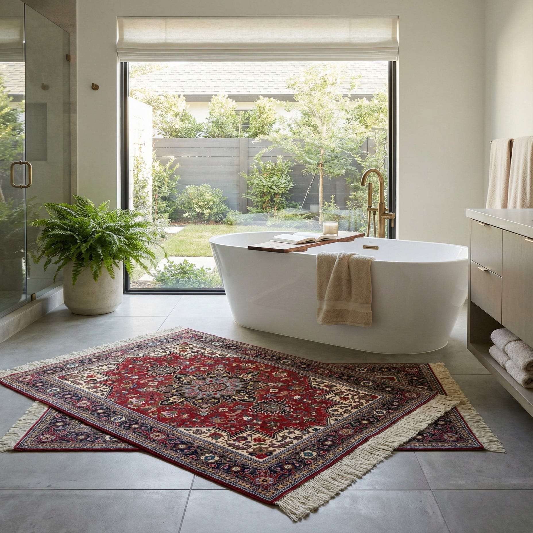 A 3x5 rectangular traditional Lahour rug in rich red with an intricate floral medallion pattern and navy border.
