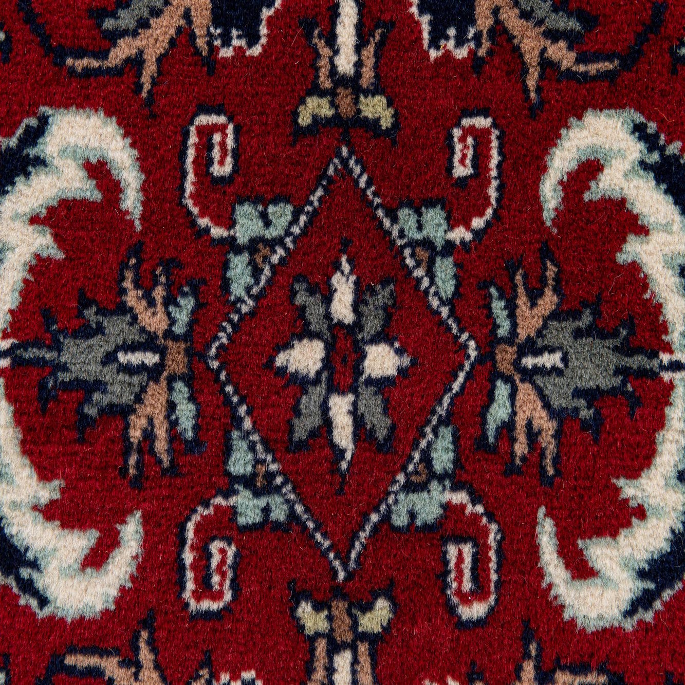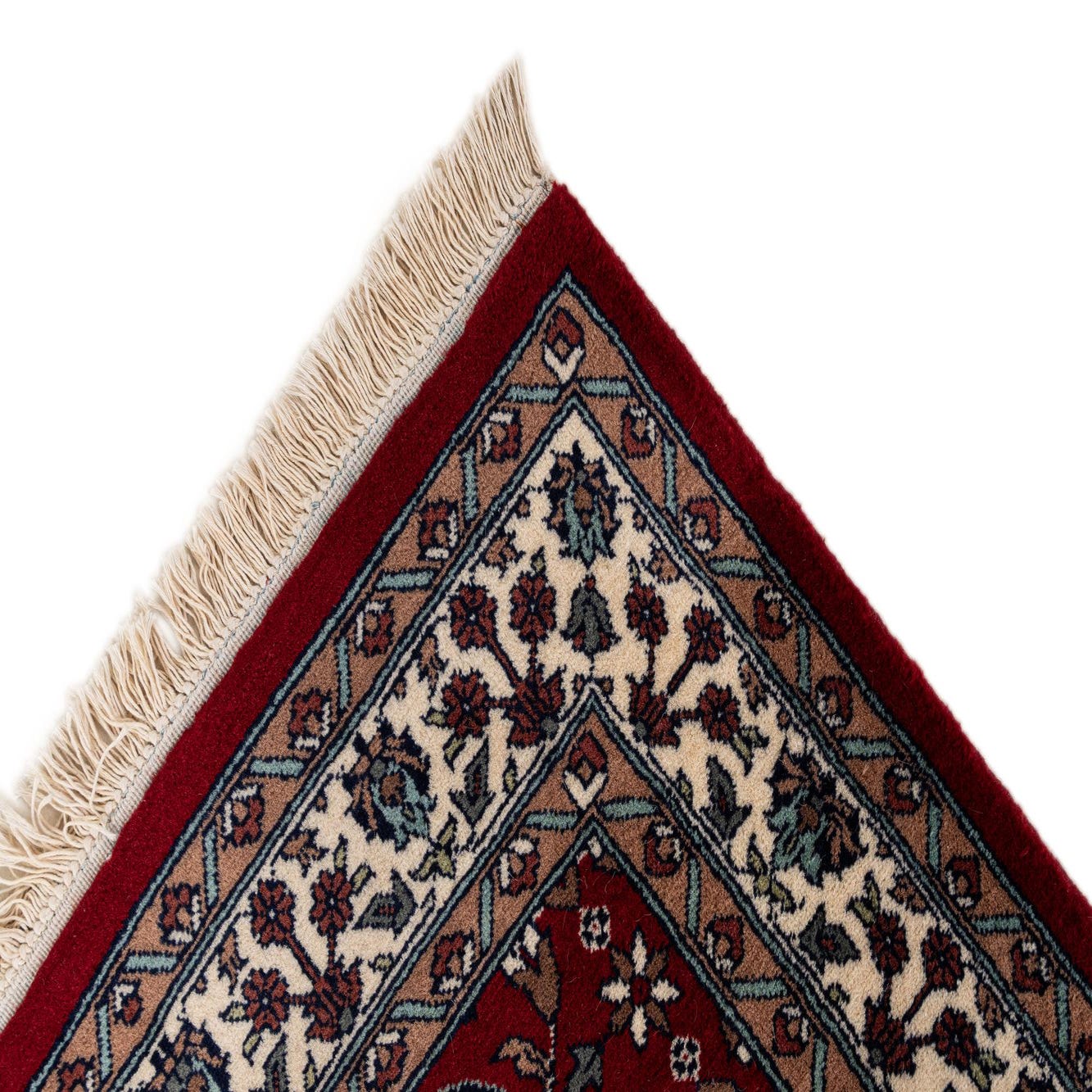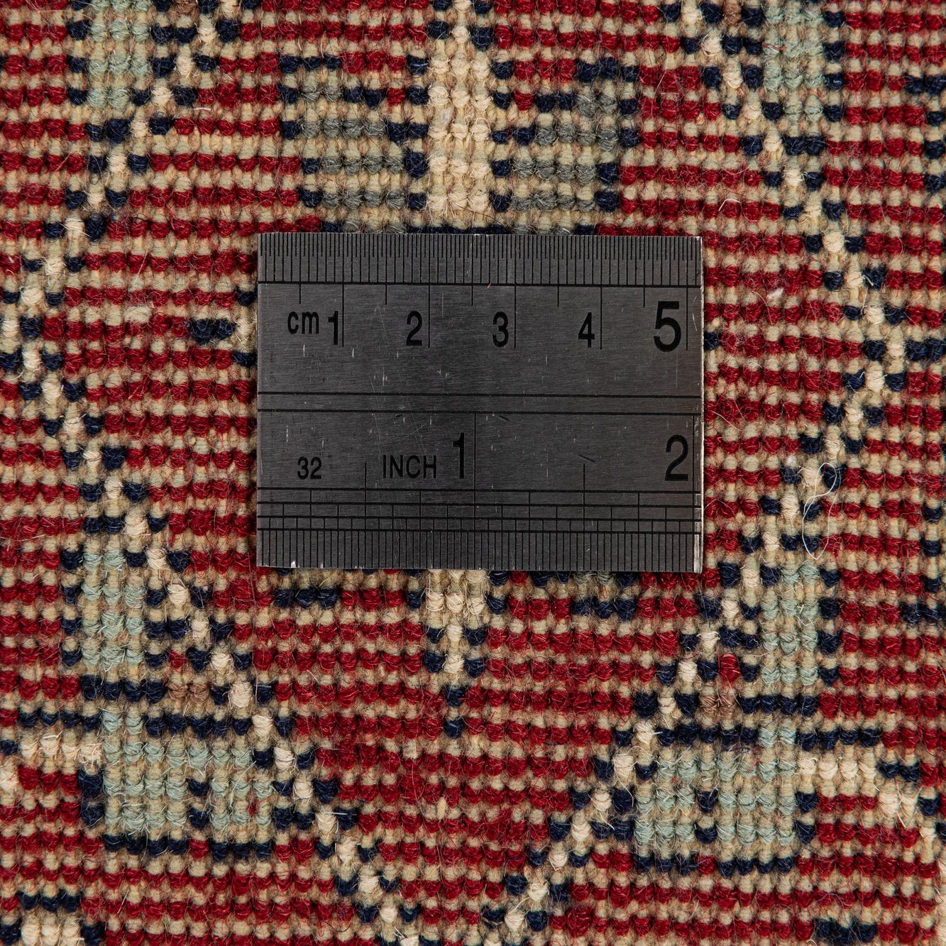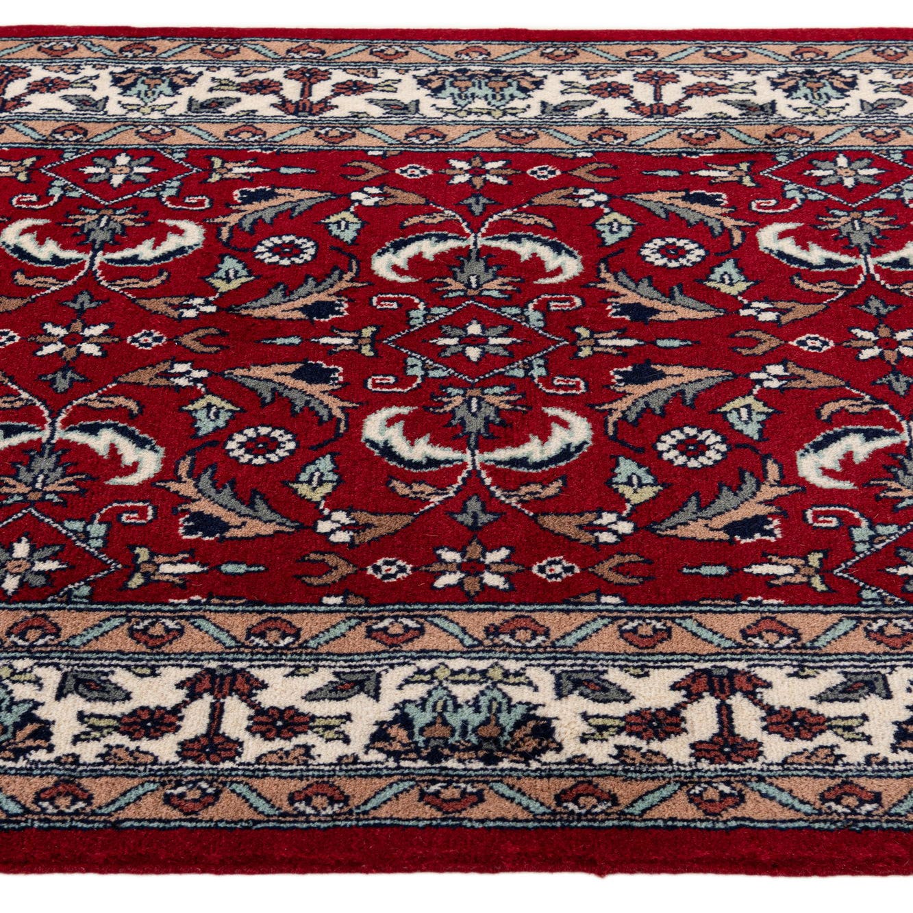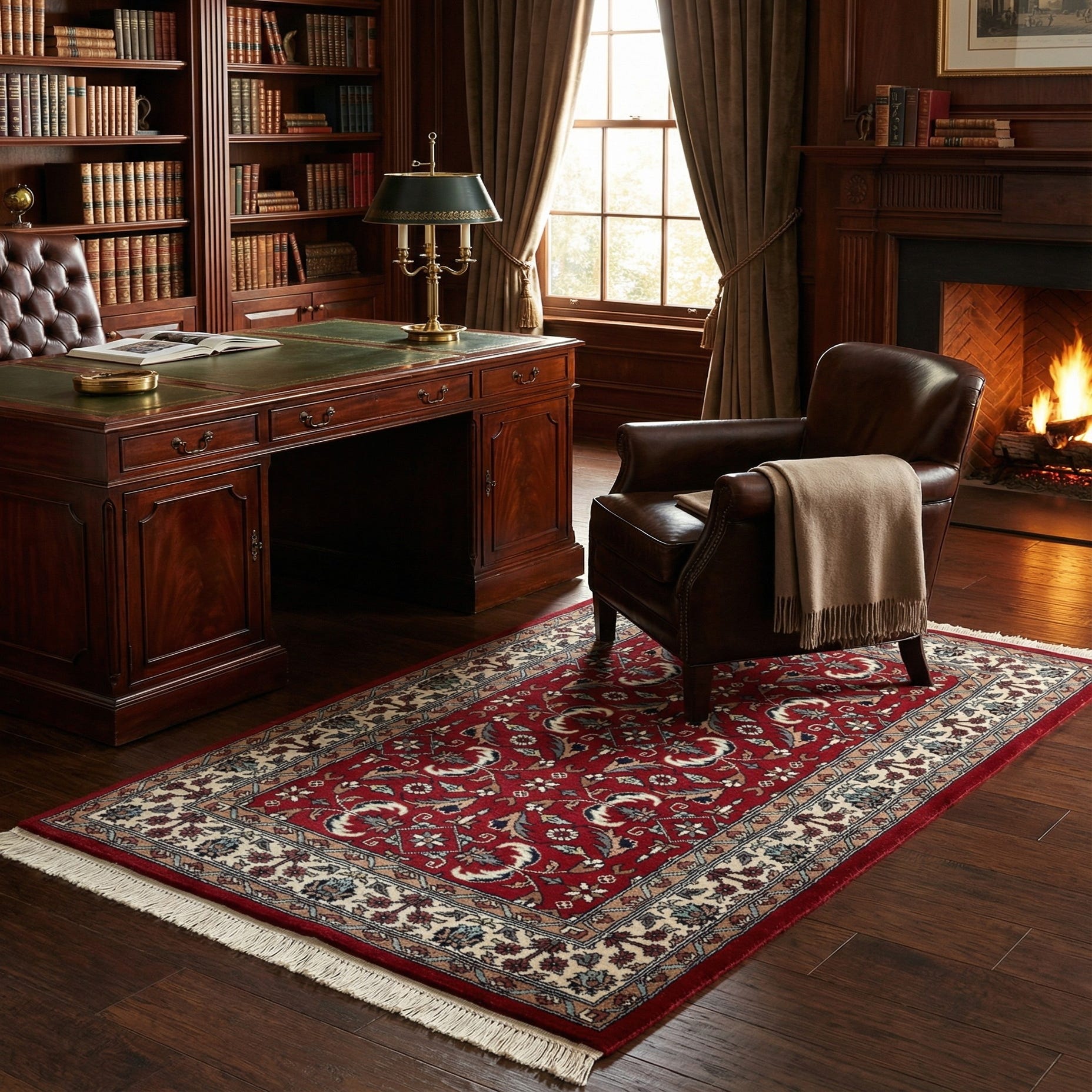 A 3x5 rectangular Lahour rug in traditional red with intricate floral and medallion patterns, featuring a cream border and fringe.