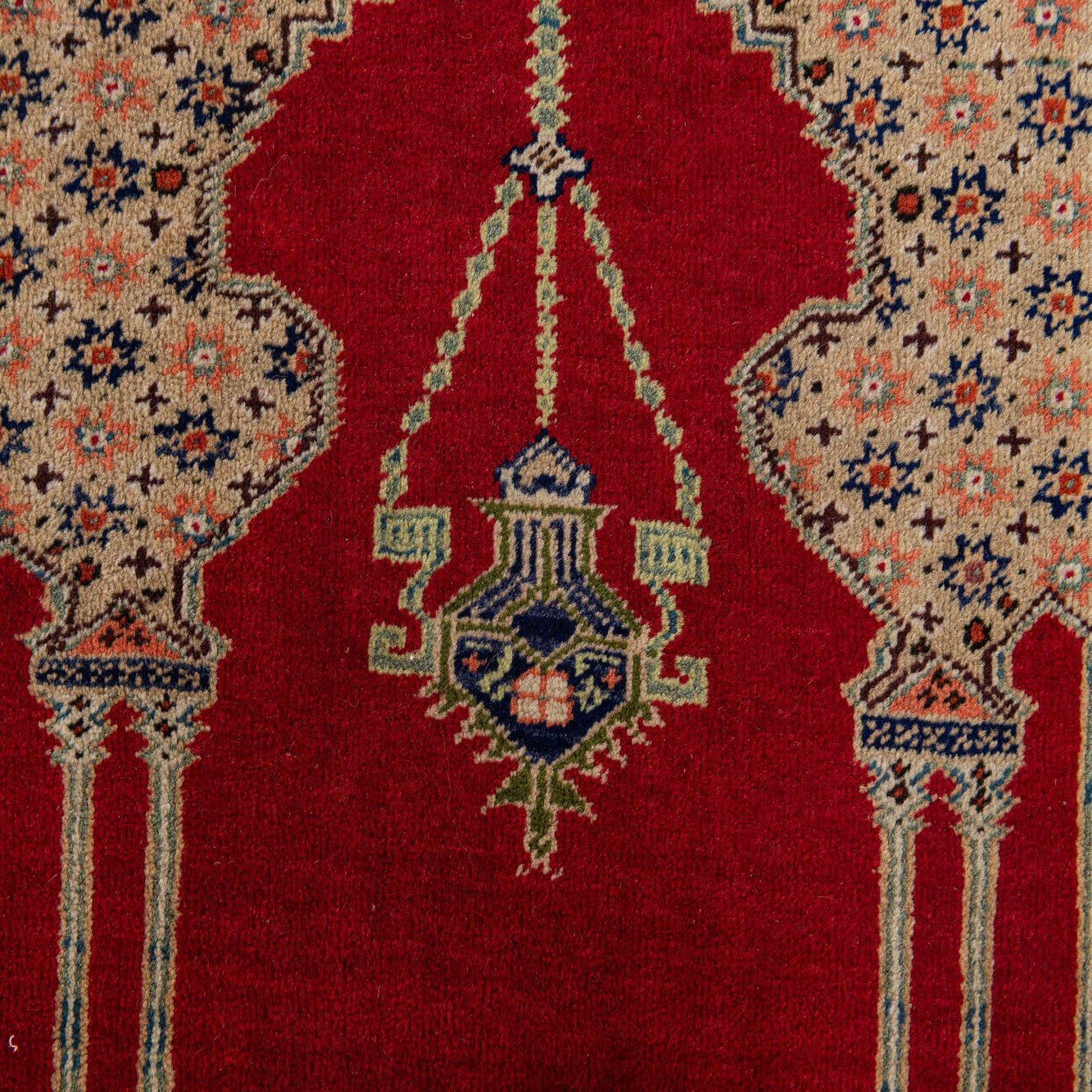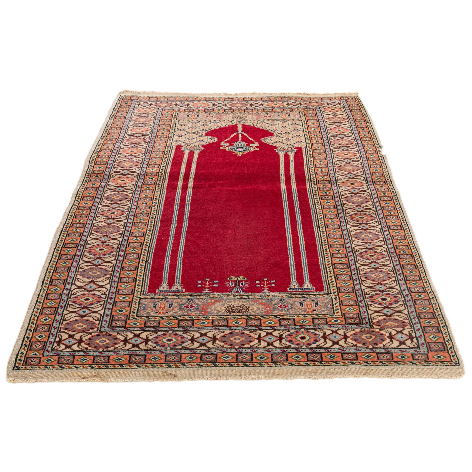 A classic prayer-rug layout anchors this hand-knotted wool piece: a deep red field forms a clear, tactile central mihrab arch framed by slender columns and a suspended pendant motif. The arch spandrels and multiple borders introduce a busy, small-scale floral and geometric pattern in ivory, brown, green, light blue and orange, providing contrast against the red ground. The 100% wool pile feels soft and dense underfoot with a low-to-medium profile; the hand-knotted construction gives the surface a smooth, slightly variegated texture that you can both see and feel.