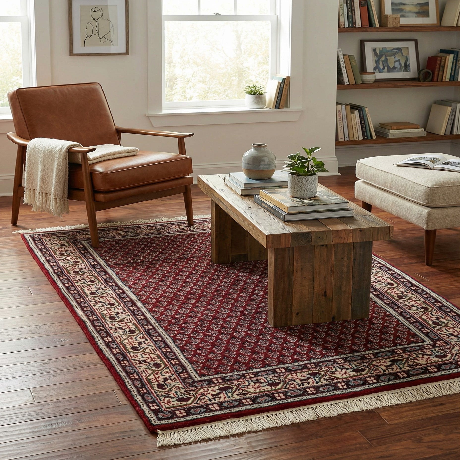 This piece works well as an entryway anchor, a cozy addition in a study or den, or layered beneath a coffee table to introduce color and pattern to a living area. It pairs naturally with warm wood tones, leather seating and neutral upholstery, and complements both traditional and transitional interiors where rich, focused color is desired.