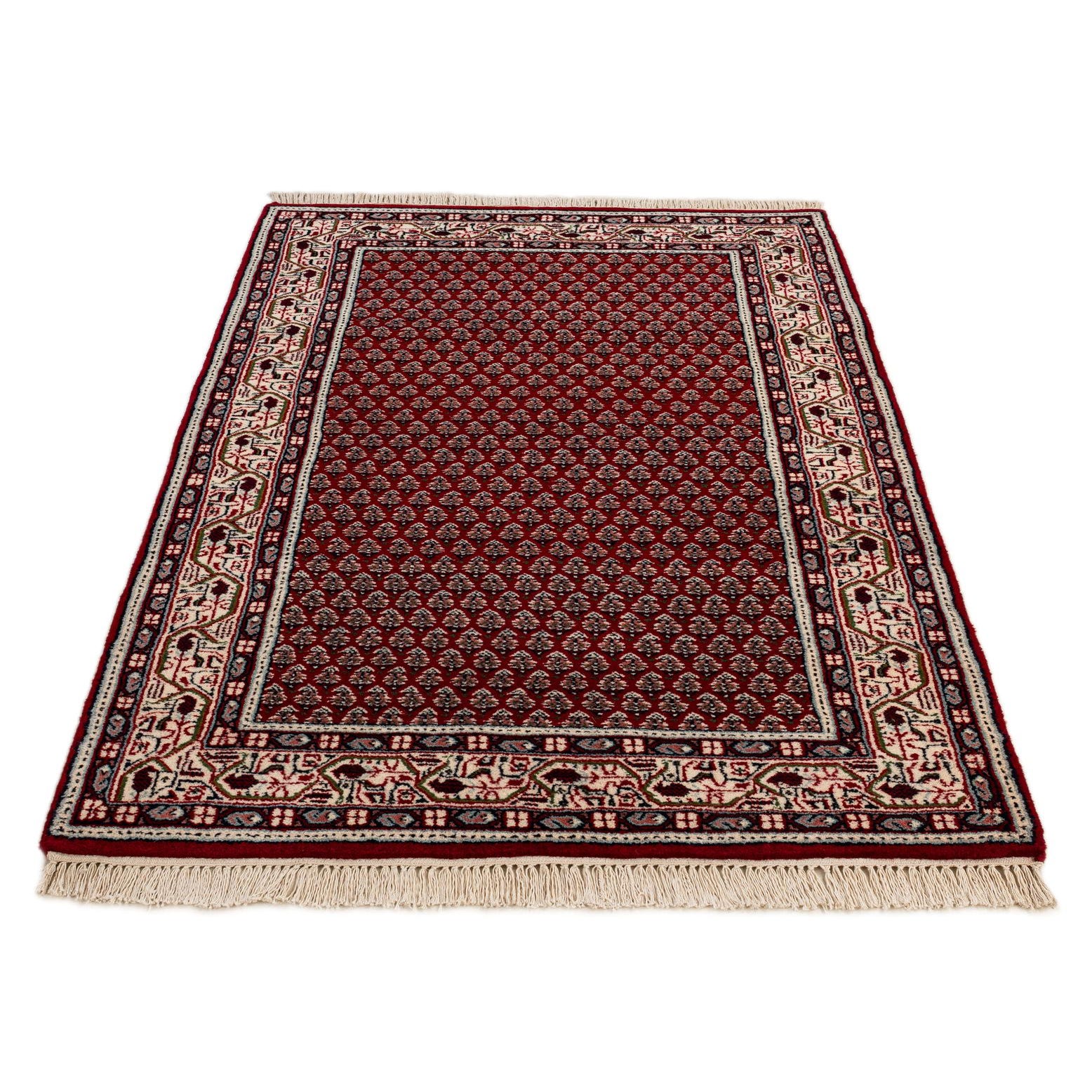 A 3x5 rectangular Mir wool rug featuring a traditional Oriental pattern with a deep red field and intricate cream and multi-colored borders.