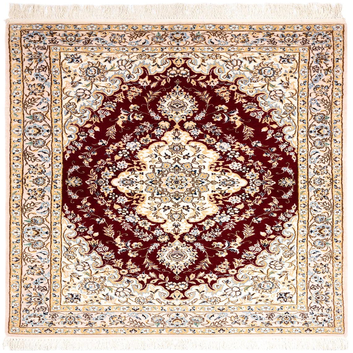 This Nain collection rug is a 3x5 handcrafted piece, blending wool and silk materials to create a harmonious combination of durability and lustrous finish. It features a central medallion surrounded by intricate floral and vine motifs, evoking a sense of traditional elegance. The palette includes a rich red background with complementary shades of cream, beige, brown, purple, and blue that contribute to its visual appeal and versatility.