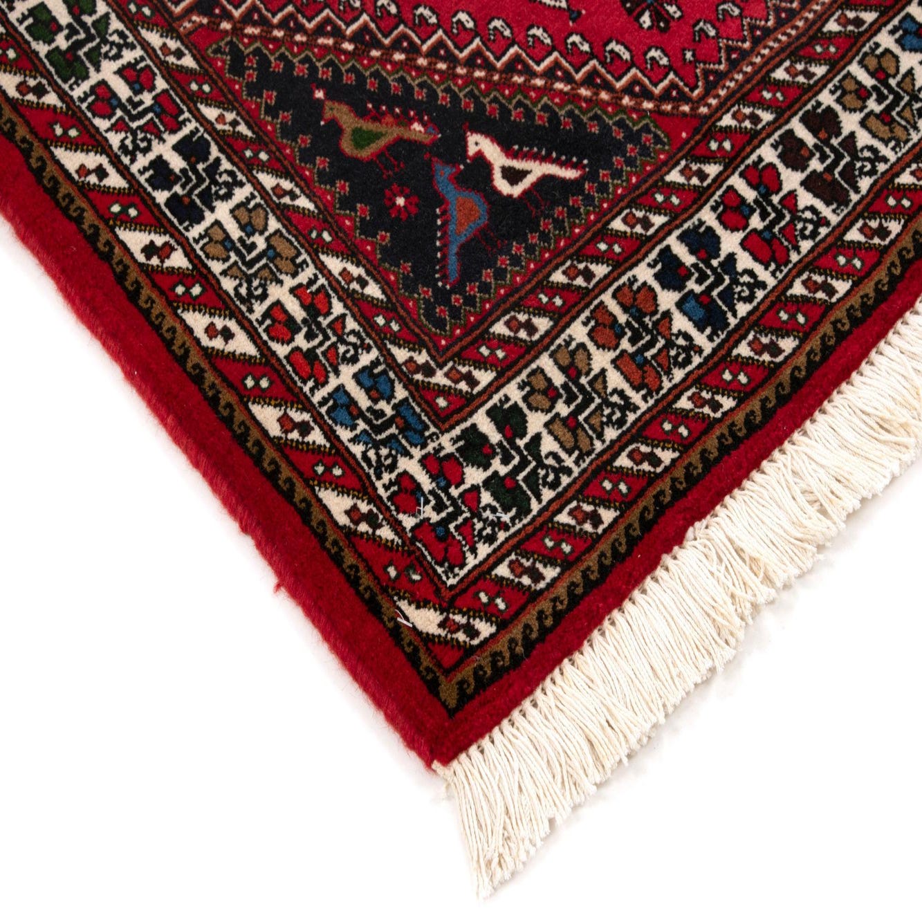 Primary color is Red. Colors in this rug include: Red, Brown, Cream, Black.