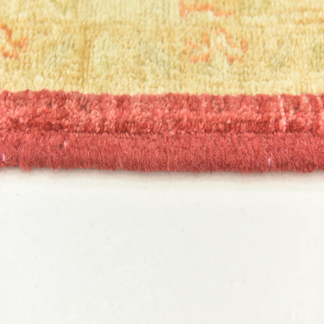 The rug's texture is substantial and indicative of its hand-knotted construction, providing both visual depth and a tactile experience. Edged with a fringe that complements its classic aesthetic, the Peshawar Ziegler rug would readily enhance a variety of interior spaces. This rug could serve as an anchor for a small seating area, bring warmth to a study, or add a sophisticated touch to a bedroom. Its classic pattern and warm color palette make it versatile for interiors ranging from traditional to more eclectic or transitional designs where it can serve as a focal point or as a complement to existing decor.