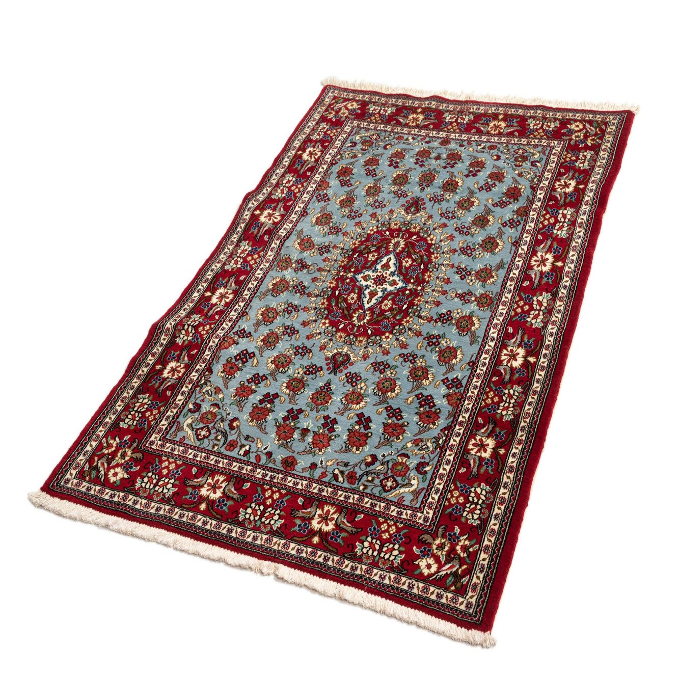 A rectangular 3x5 handmade Persian rug with a red border and a light blue field, featuring intricate floral and medallion patterns.