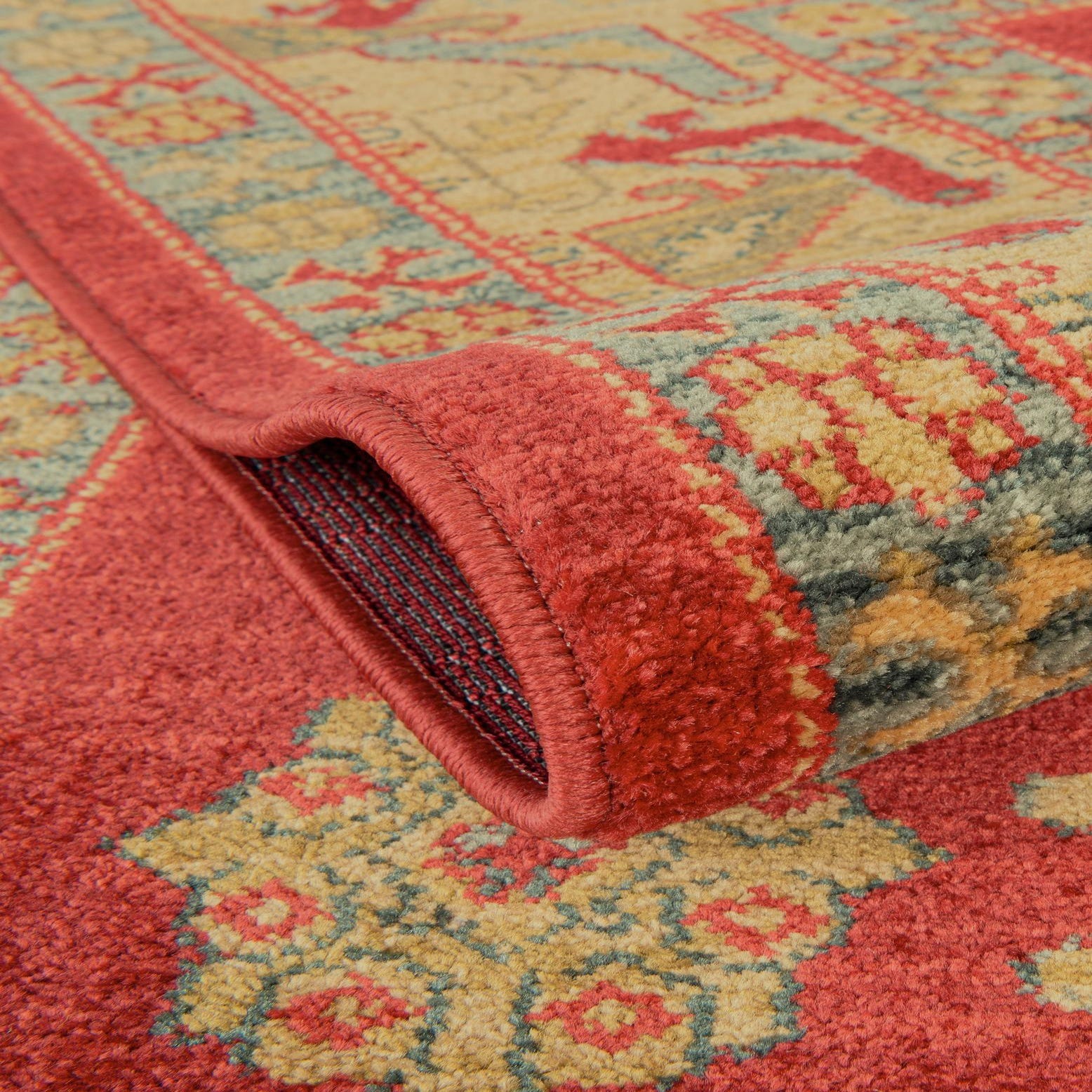 Primary color is Red. Colors in this rug include: Red, Cream, Light Blue.