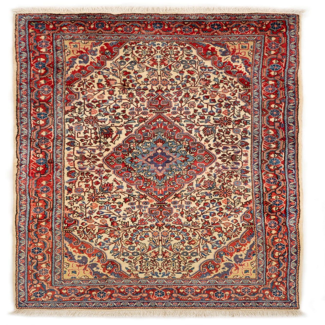 Primary color is Red. Colors in this rug include: Red, Cream, Blue.