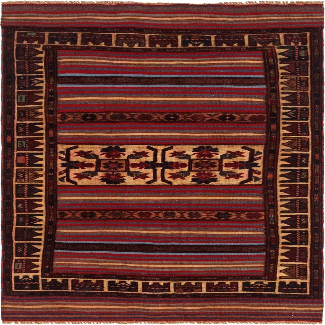 A 3x5 rectangular Sumak rug with a Southwestern tribal stripe pattern in various shades of red, blue, and brown, featuring a central floral motif on a beige background and a geometric border.