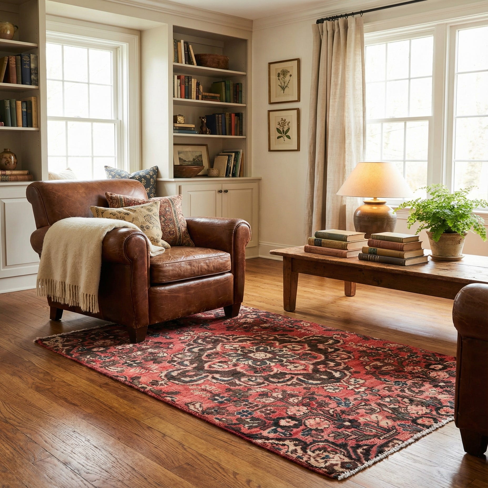 This hand-knotted Ultra Vintage rug is a distinguished piece crafted from 100% wool. Measuring 3x5 feet, it presents a rich tapestry of color and design. The deep red background sets a dramatic stage for the traditional motif, which features a harmonious blend of red, brown, beige, and navy blue hues. The central medallion, surrounded by intricate floral details and border patterns, offers both symmetry and visual interest.