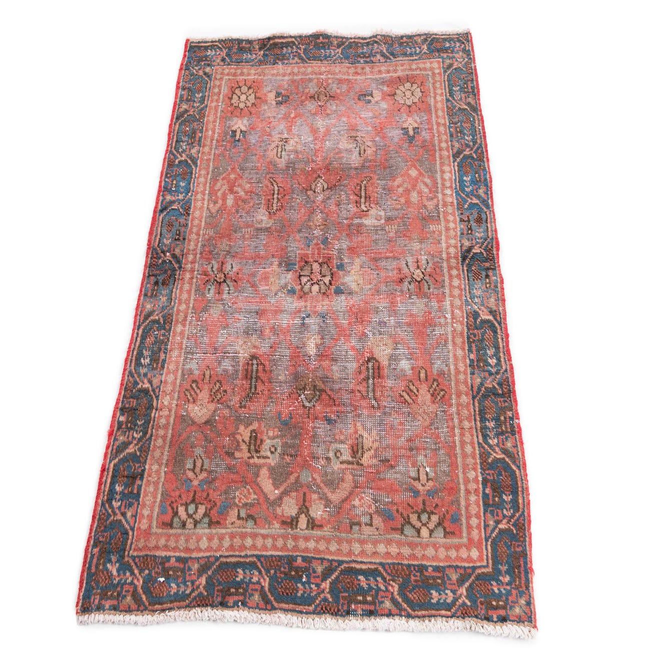 This rug works well in small living rooms or a cozy reading corner, layered under a low coffee table or at the foot of a bed to add color and pattern without overwhelming the space. It pairs naturally with warm wood tones, leather seating, and brass or aged-metal accents, and also complements mid-century, traditional, or eclectic interiors where a worn, collected look is desired. Navy textiles and ivory linens will pick up the rug’s accents and help tie the room together.