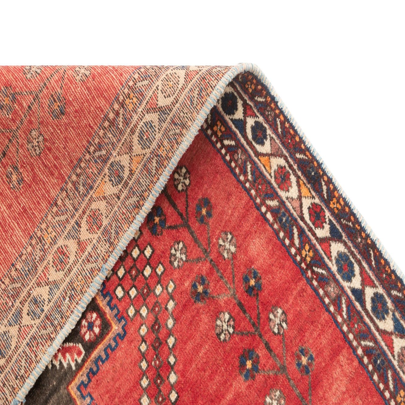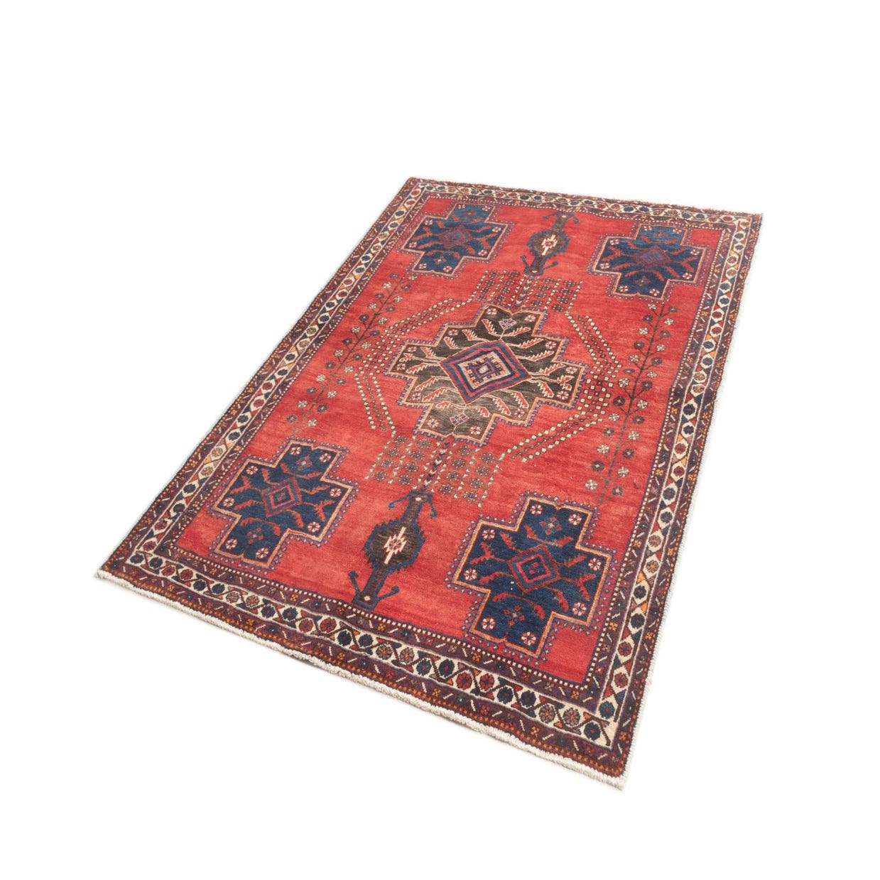 A 3x5 rectangular red traditional wool rug with a central medallion and navy blue, black, and white geometric patterns.