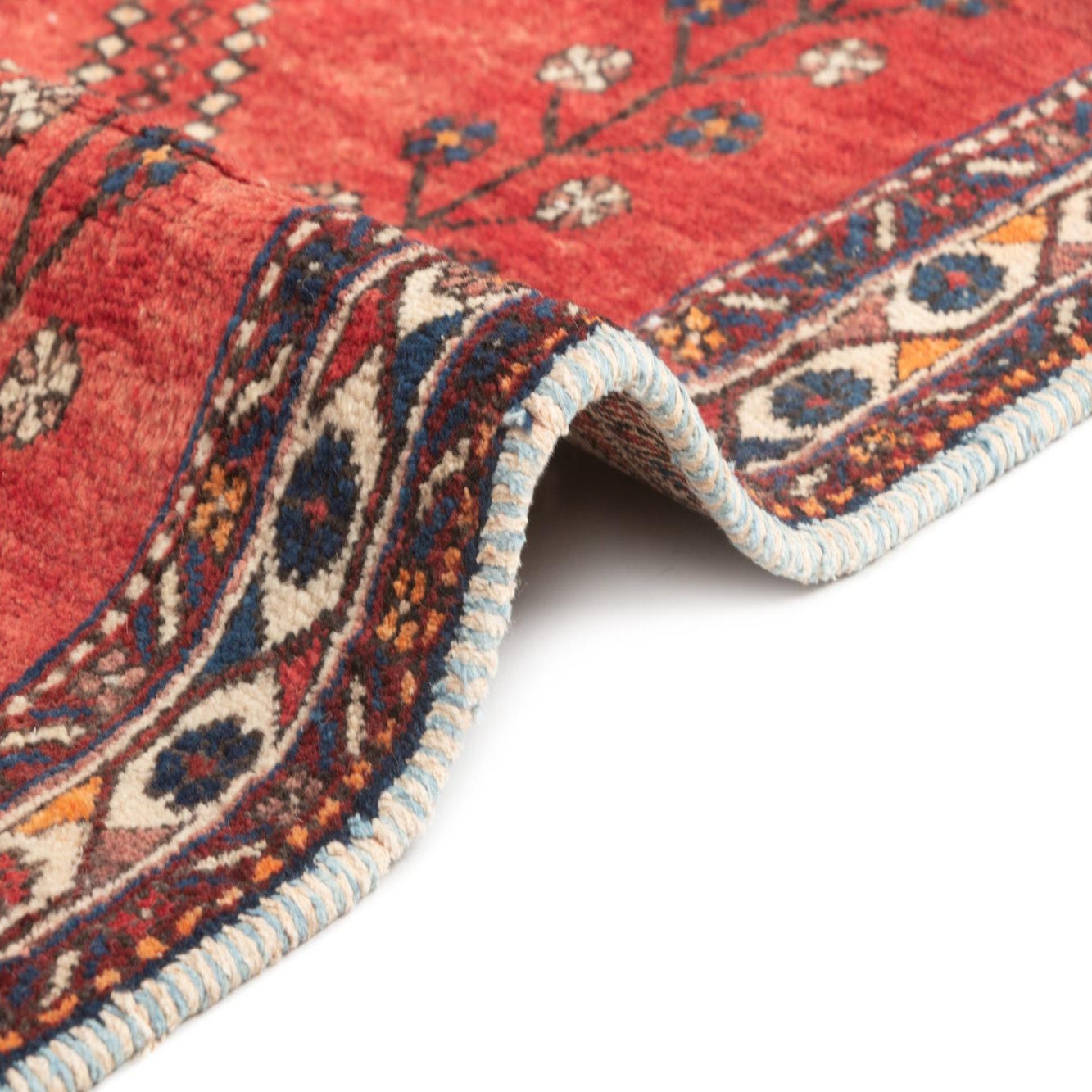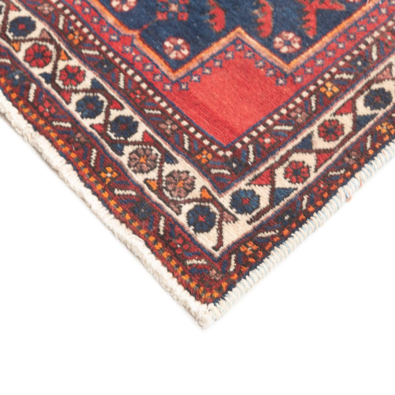 This hand-made Vintage collection rug presents a traditional design realized in a rich palette of red, dark blue, and cream, establishing a bold yet harmonious contrast. The central composition of geometric medallions is framed by an intricate border, featuring a repeated pattern that encapsulates classical rug motifs. The red background accentuates the dark blue geometric figures, while the cream accents add a pleasing visual pop that highlights the detail within the pattern.