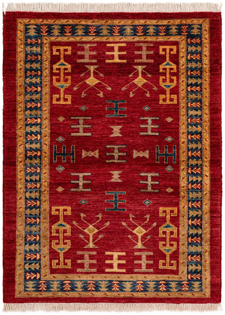 Primary color is Red. Colors in this rug include: Red, Blue, Brown, Green, Navy Blue, Yellow.