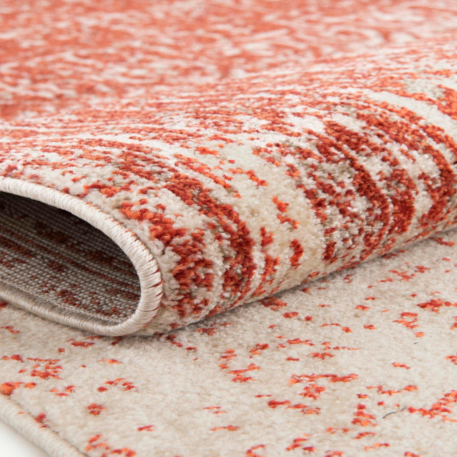 The Angelica collection presents a 4 ft round rug that showcases a dynamic and intricate pattern, reminiscent of traditional designs. The machine-woven construction ensures precision in the detailing of the motif, carried out in a rich palette of red, highlighted by complementary shades of beige, light brown, and terracotta. The bold red background serves as a statement piece, while the intricate designs in lighter tones create a sense of depth and texture.