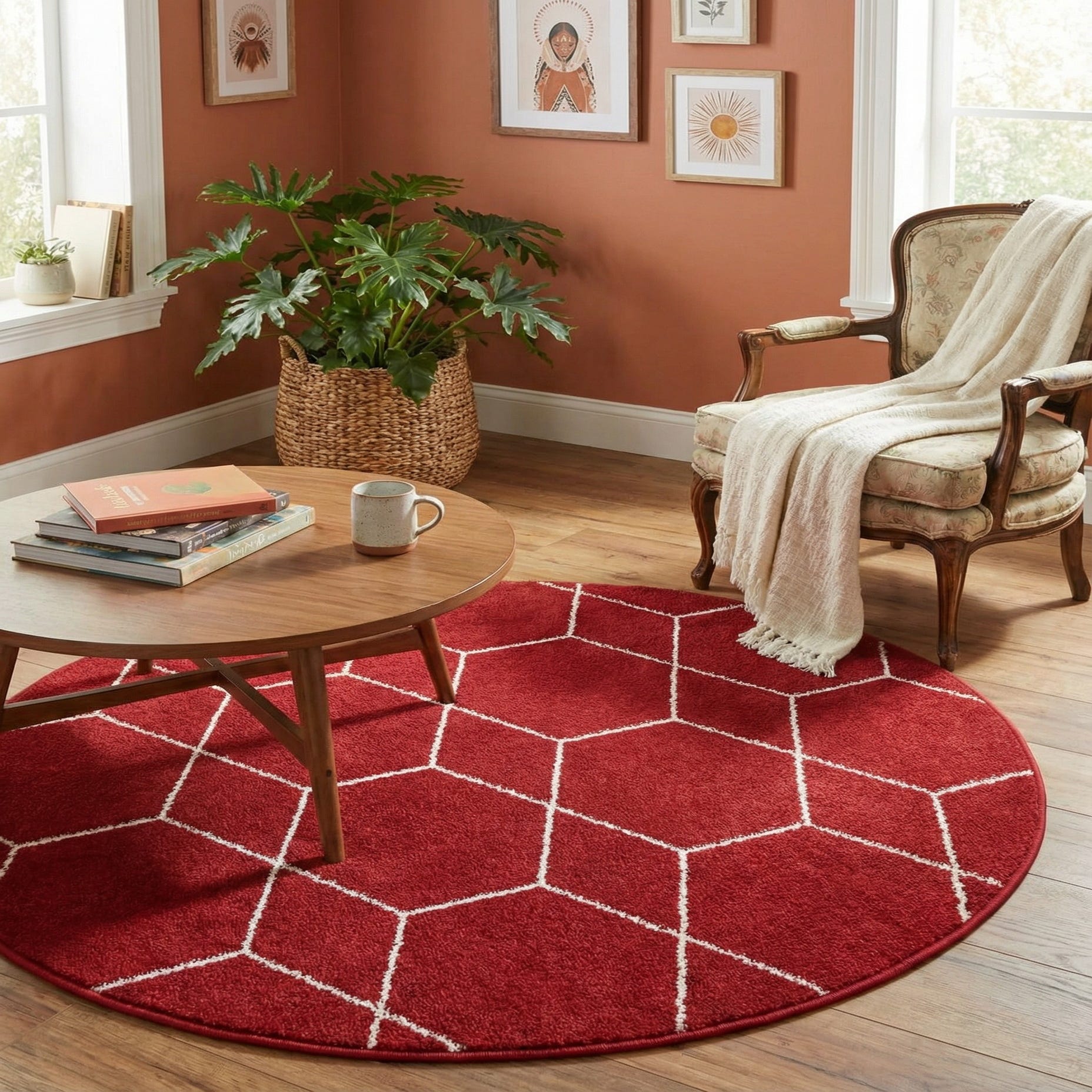 This round rug works well beneath a small dining set, centered in a cozy seating area, or as an accent layer in a home office or entry. It pairs nicely with warm wood tones and mid-century modern furniture, as well as with crisp white or neutral upholstery to let the red take center stage. For a more layered look, combine it with brass or black metal accents and simple geometric decor to reinforce the rug’s contemporary character.