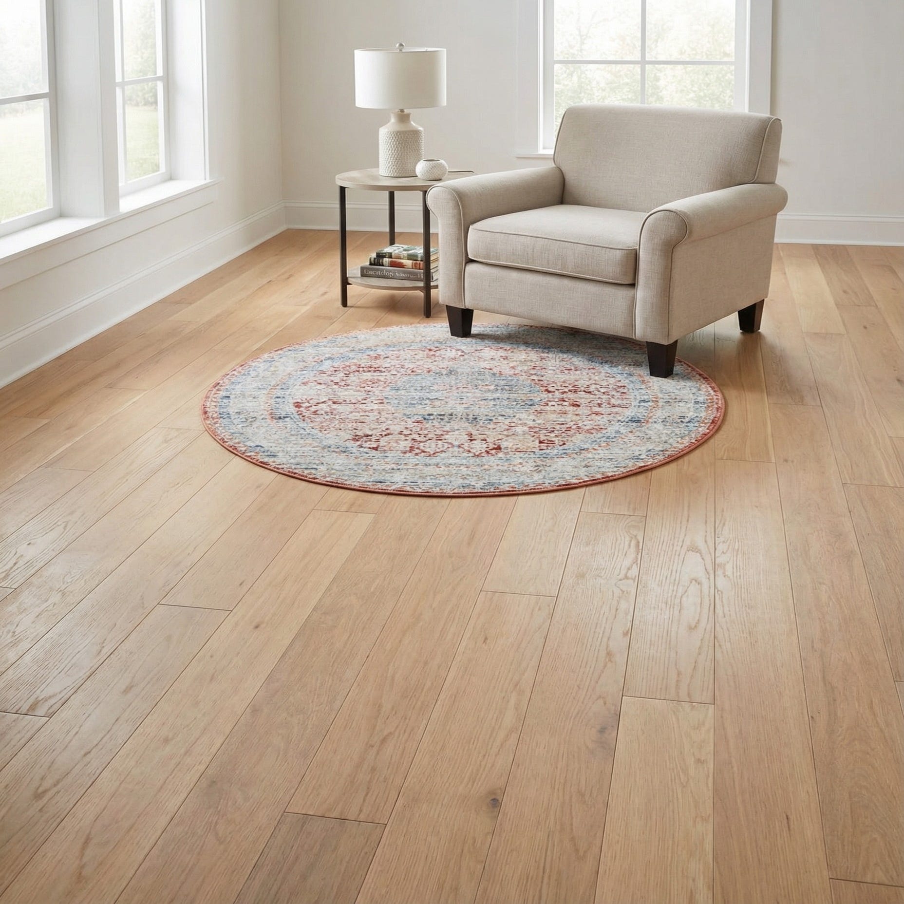 This piece works well in transitional, cottage, or classic interiors. Place it under a round bistro or café table, anchor a small seating area or reading nook, or use it in an entry to introduce color and pattern without overwhelming the space. Pair it with warm wood furniture and neutral upholstery to let the red and blue tones take center stage, or add navy and olive accents for a coordinated, layered look.