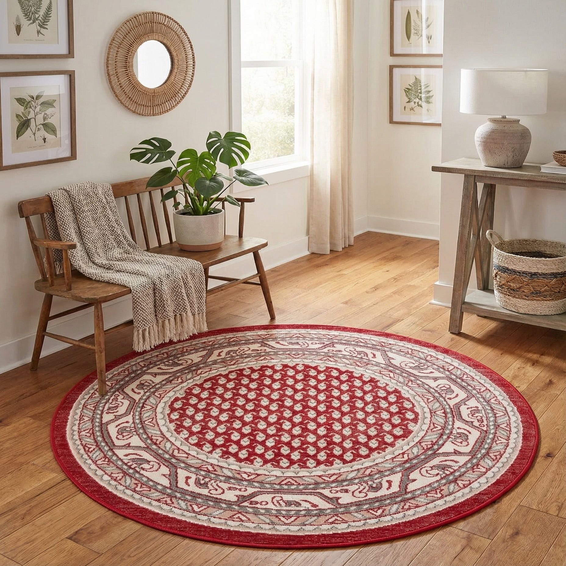 Well suited for a variety of interiors, this rug anchors a small dining nook or a round breakfast table, and works well in an entryway to introduce color and pattern. It also complements transitional and farmhouse schemes when paired with neutral linen seating or warm wood furnishings, and can add a lively contrast to gray or ivory upholstery. Use it to layer texture over hardwood or tile floors for a pulled-together look.